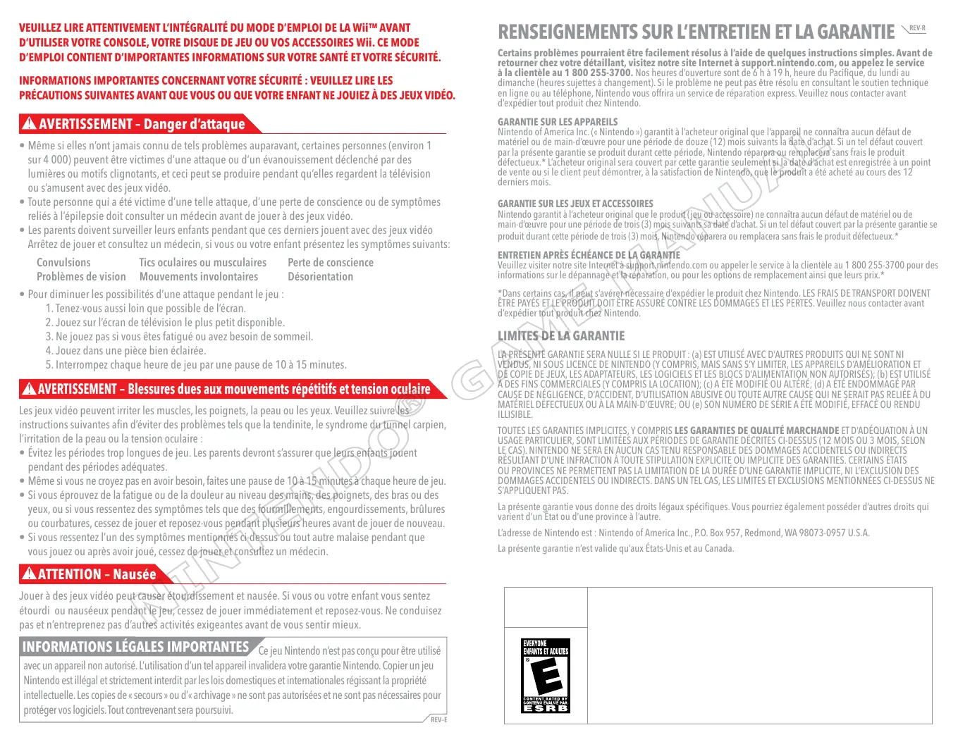 Nintendo of America Inc. (« Nintendo ») garantit à l'acheteur original que l'apparil ne connaîtreaucun défaut de matériel ou de main-d'oeuvre pour une période de douze (12) mois suivants la date d'achat. Si un tel défaut couvert par la presente garantite se produit durant cette période, Nintendo réparée ou remplaça sera sans frais le produit défectieux.* L'acheteur original sera couvert par cette garantie seulement si la date d'achat est enregistrée à un point de vente ou si le client peut démonter, à la satisfaction de Nintendo, que le produit a été acheté au cours des 12 derniers mois.