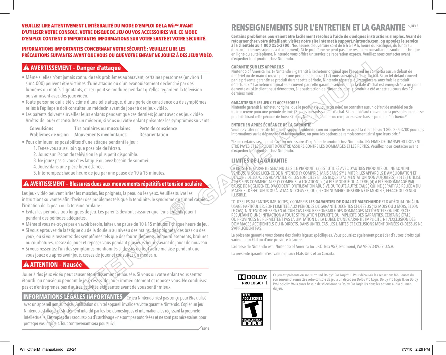 Veuillez visiter notre site Internet à support.nintendo.com ou appeler le service à la clientèle au 1 800 255-3700 pour des informations sur le dépannage et la réparation, ou pour les options de remplacement ainsi que leurs prix.