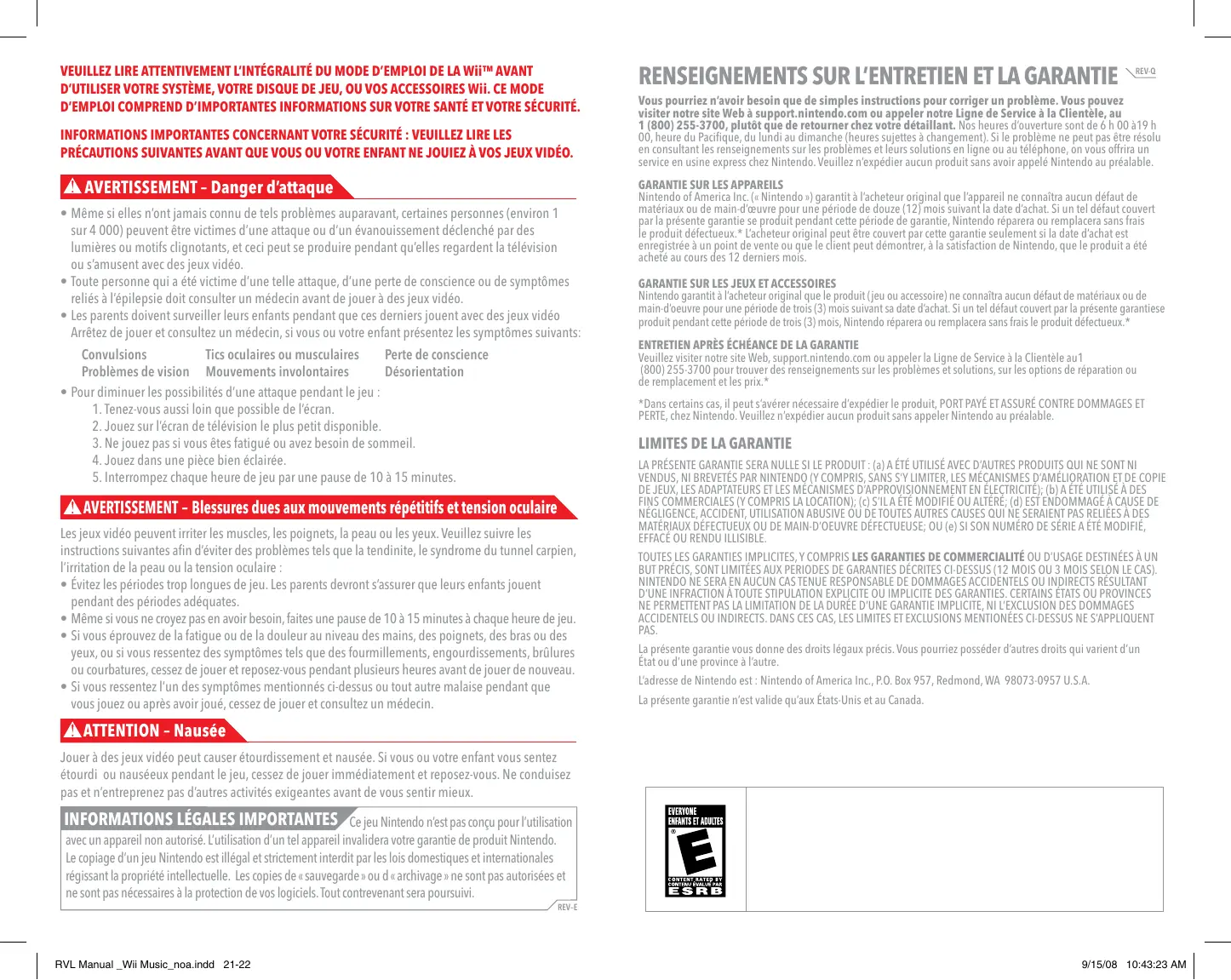 - Si vous ressentez l'un des symptômes mentionnés ci-dessus ou tout autre malaise pendant que vous jouez ou après avoir joué, cessez de jouer et consultez un médecin.