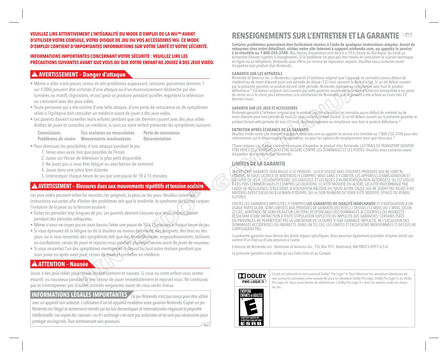 RENSEIGNEMENTS SUR L’ENTRETIEN ET LA GARANTIE REV-R Certains problèmes pourraient être facilement résolus à l’aide de quelques instructions simples. Avant de retourner chez votre détaillant, visitez notre site Internet à support.nintendo.com, ou appelez le service à la clientèle au 1 800 255-3700. Nos heures d’ouverture sont de 6 h à 19 h, heure du Pacifique, du lundi au dimanche (heures sujettes à changement). Si le problème ne peut pas être résolu en consultant le soutien technique en ligne ou au téléphone, Nintendo vous offrira un service de réparation express. Veuillez nous contacter avant d’expédier tout produit chez Nintendo. GARANTIE SUR LES APPAREILS Nintendo of America Inc. (« Nintendo ») garantit à l’acheteur original que l’appareil ne connaîtra aucun défaut de matériel ou de main-d’œuvre pour une période de douze (12) mois suivants la date d’achat. Si un tel défaut couvert par la présente garantie se produit durant cette période, Nintendo réparera ou remplacera sans frais le produit défectueux.* L’acheteur original sera couvert par cette garantie seulement si la date d’achat est enregistrée à un point de vente ou si le client peut démontrer, à la satisfaction de Nintendo, que le produit a été acheté au cours des 12 derniers mois. GARANTIE SUR LES JEUX ET ACCESSOIRES Nintendo garantit à l’acheteur original que le produit (jeu ou accessoire) ne connaîtra aucun défaut de matériel ou de main-d’œuvre pour une période de trois (3) mois suivants sa date d’achat. Si un tel défaut couvert par la présente garantie se produit durant cette période de trois (3) mois, Nintendo réparera ou remplacera sans frais le produit défectueux.* ENTRETIEN APRÈS ÉCHÉANCE DE LA GARANTIE Veuillez visiter notre site Internet à support.nintendo.com ou appeler le service à la clientèle au 1 800 255-3700 pour des informations sur le dépannage et la réparation, ou pour les options de remplacement ainsi que leurs prix.* *Dans certains cas, il peut s’avérer nécessaire d’expédier le produit chez Nintendo. LES FRAIS DE TRANSPORT DOIVENT ÊTRE PAYÉS ET LE PRODUIT DOIT ÊTRE ASSURÉ CONTRE LES DOMMAGES ET LES PERTES. Veuillez nous contacter avant d’expédier tout produit chez Nintendo.