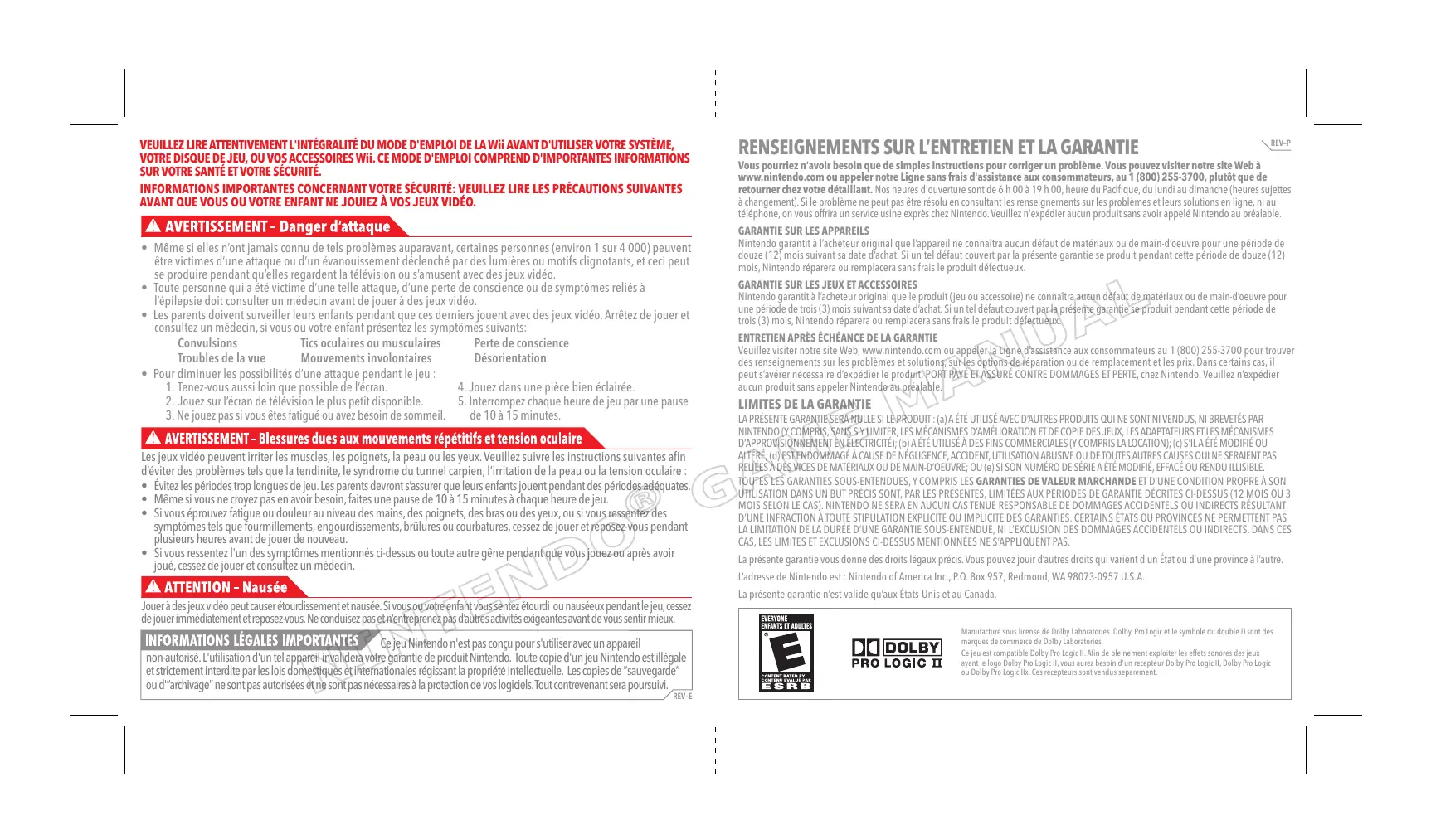 LIMITES DE LA GARANTIE LA PRÉSENTE GARANTIE SERA NULLE SI LE PRODUIT : (a) A ÉTÉ UTILISÉ AVEC D’AUTRES PRODUITS QUI NE SONT NI VENDUS, NI BREVETÉS PAR NINTENDO (Y COMPRIS, SANS S’Y LIMITER, LES MÉCANISMES D’AMÉLIORATION ET DE COPIE DES JEUX, LES ADAPTATEURS ET LES MÉCANISMES D’APPROVISIONNEMENT EN ÉLECTRICITÉ); (b) A ÉTÉ UTILISÉ À DES FINS COMMERCIALES (Y COMPRIS LA LOCATION); (c) S’IL A ÉTÉ MODIFIÉ OU ALTÉRÉ; (d) EST ENDOMMAGÉ À CAUSE DE NÉGLIGENCE, ACCIDENT, UTILISATION ABUSIVE OU DE TOUTES AUTRES CAUSES QUI NE SERAIENT PAS RELIÉES À DES VICES DE MATÉRIAUX OU DE MAIN-D’OEUVRE; OU (e) SI SON NUMÉRO DE SÉRIE A ÉTÉ MODIFIÉ, EFFACÉ OU RENDU ILLISIBLE. TOUTES LES GARANTIES SOUS-ENTENDUES, Y COMPRIS LES GARANTIES DE VALEUR MARCHANDE ET D’UNE CONDITION PROPRE À SON UTILISATION DANS UN BUT PRÉCIS SONT, PAR LES PRÉSENTES, LIMITÉES AUX PÉRIODES DE GARANTIE DÉCRITES CI-DESSUS (12 MOIS OU 3 MOIS SELON LE CAS). NINTENDO NE SERA EN AUCUN CAS TENUE RESPONSABLE DE DOMMAGES ACCIDENTELS OU INDIRECTS RÉSULTANT D’UNE INFRACTION À TOUTE STIPULATION EXPLICITE OU IMPLICITE DES GARANTIES. CERTAINS ÉTATS OU PROVINCES NE PERMETTENT PAS LA LIMITATION DE LA DURÉE D’UNE GARANTIE SOUS-ENTENDUE, NI L’EXCLUSION DES DOMMAGES ACCIDENTELS OU INDIRECTS. DANS CES CAS, LES LIMITES ET EXCLUSIONS CI-DESSUS MENTIONNÉES NE S’APPLIQUENT PAS. La présente garantie vous donne des droits légaux précis. Vous pouvez jouir d’autres droits qui varient d’un État ou d’une province à l’autre. L’adresse de Nintendo est : Nintendo of America Inc., P.O. Box 957, Redmond, WA 98073-0957 U.S.A. La présente garantie n’est valide qu’aux États-Unis et au Canada. Manufacturé sous license de Dolby Laboratories. Dolby, Pro Logic et le symbole du double D sont des marques de commerce de Dolby Laboratories. Ce jeu est compatible Dolby Pro Logic II. Afin de pleinement exploiter les effets sonores des jeux ayant le logo Dolby Pro Logic II, vous aurez besoin d'un recepteur Dolby Pro Logic II, Dolby Pro Logic ou Dolby Pro Logic IIx. Ces recepteurs sont vendus separement.