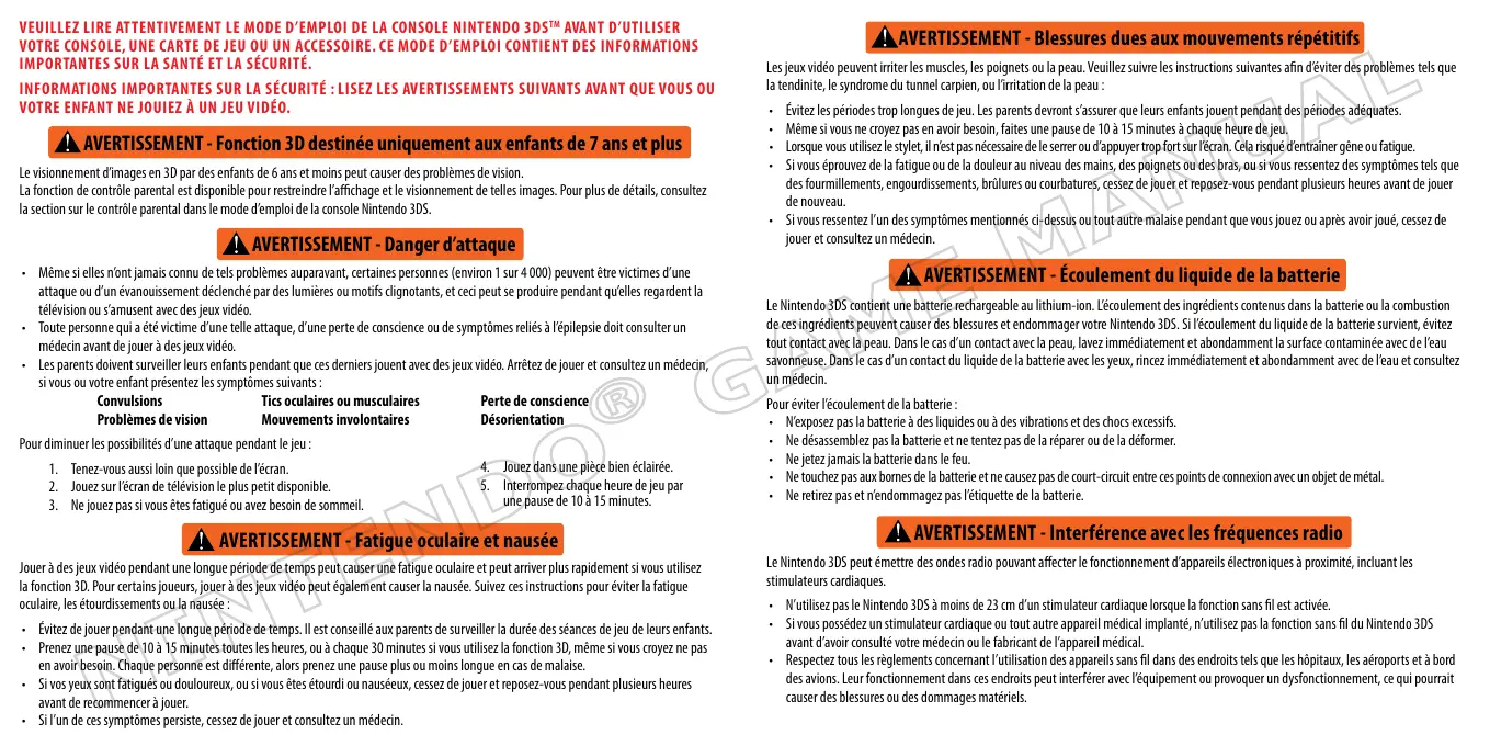 Le N牛肉 3DS contient une batterie rechargeable au lithium-ion. L'ecoulement des ingredients contens dans la batterie ou la combustion de ces Ingredients peuvent causer des blessures et endomgarerVote Nintendo 3DS.Si Iecoulement du liquide de la batterie surviert, evitez tout contact avec la peau.Dans le cas d'un contact avec la peau, lavez immediatement et abondamment la surface contaminée avec de I'eau savonneuse.Dans le cas d'un contact du liquide de la batterie avec les yeux, rince immediatement et abondamment avec de I'eau et consultez un medecin.