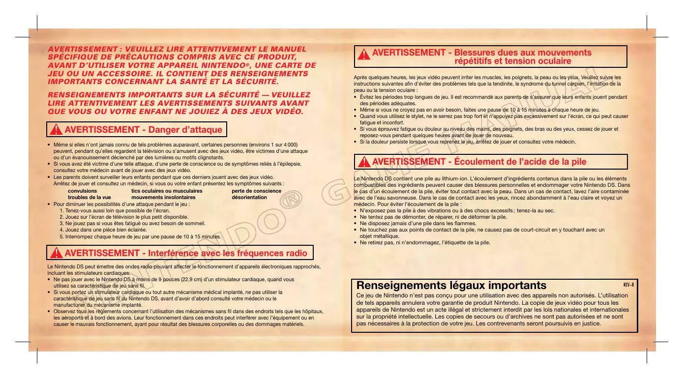 LES ISSEMENT : VEUILLEZ LIRE ATTENTIVEMENT LE MANUEL SPÉCIFIQUE DE PRÉCAUTIONS COMPRIS AVEC CE PRODUIT, AVANT D'UTILISER VOTRE APPAREIL NINTENDO®, UNE CARTE DE JEU OU UN ACCESSOIRE. IL CONTIENT DES RENSEIGNEMENTS IMPORTANTS CONCERNANT LA SANTÉ ET LA SÉCURITÉ.