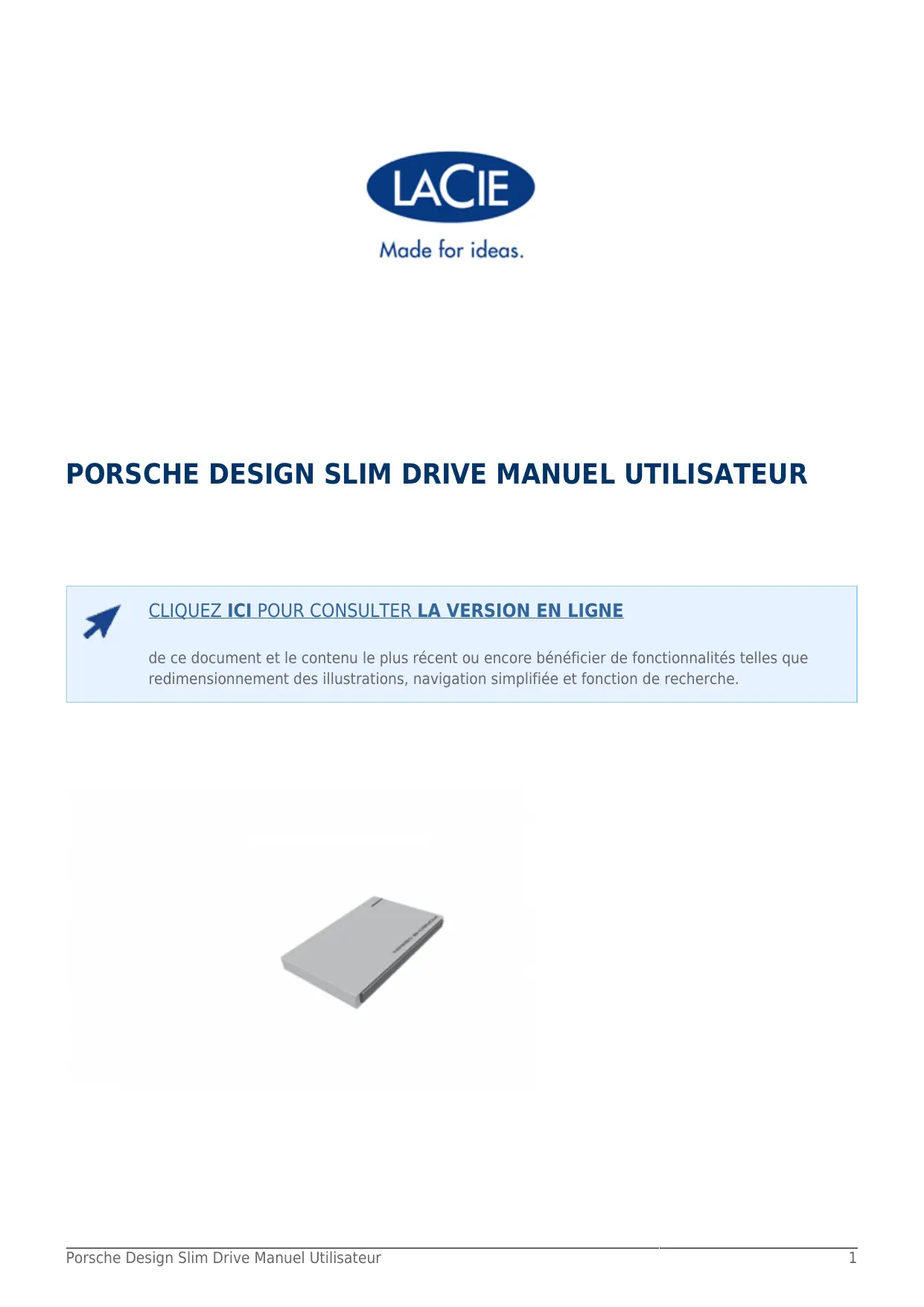 CLIQUEZ ICI POUR CONSULTER LA VERSION EN LIGNE de ce document et le contenu le plus récent ou encore bénéficier de fonctionnalités telles que redimensionnement des illustrations, navigation simplifiée et fonction de recherche. Porsche Design Slim Drive Manuel Utilisateur
