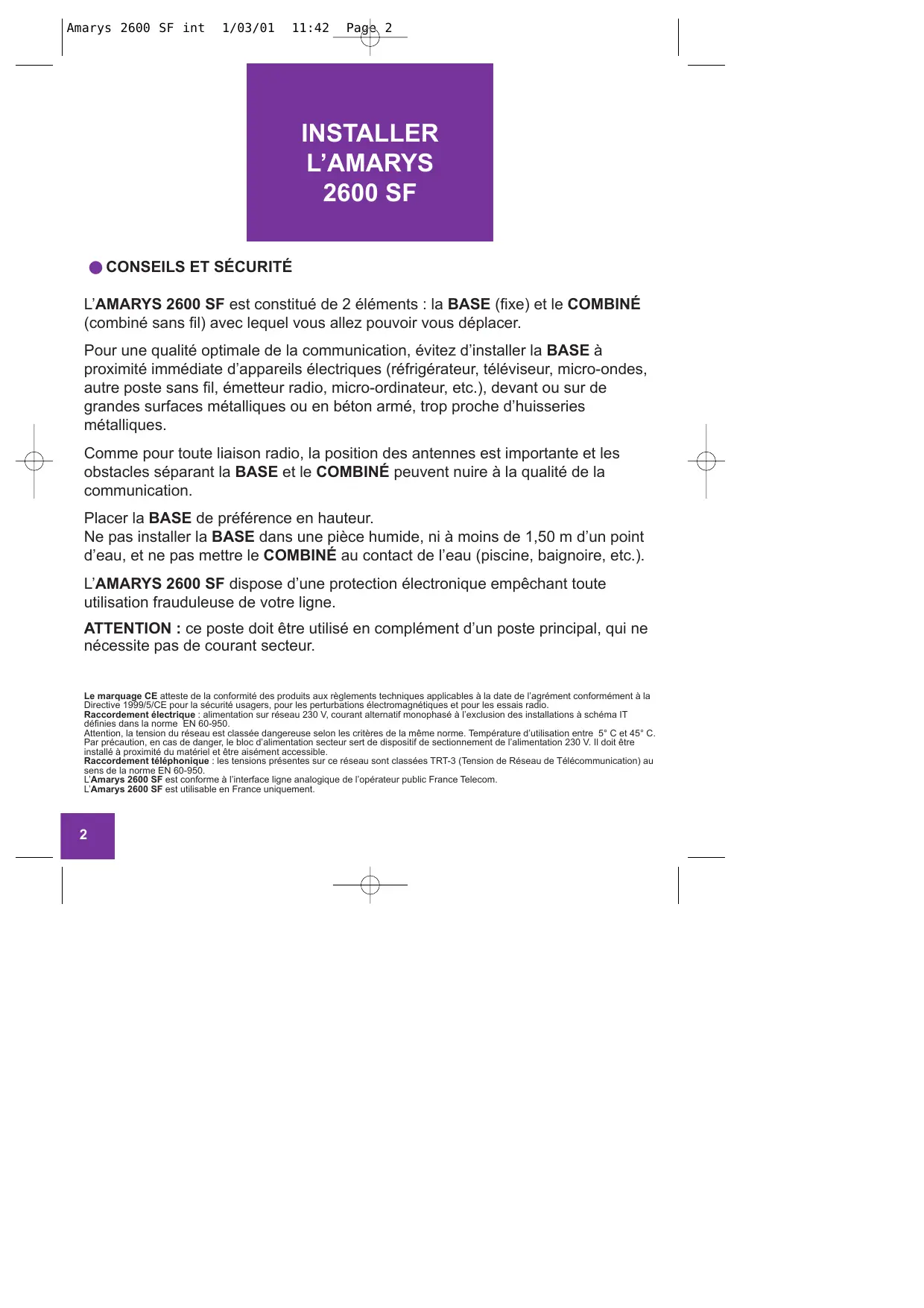 Amarys 2600 SF int 1/03/01 11:42 Page 2 INSTALLER LÕAMARYS 2600 SF ● CONSEILS ET SƒCURITƒ LÕAMARYS 2600 SF est constituŽ de 2 ŽlŽments : la BASE (fixe) et le COMBINƒ (combinŽ sans fil) avec lequel vous allez pouvoir vous dŽplacer. Pour une qualitŽ optimale de la communication, Žvitez dÕinstaller la BASE ˆ proximitŽ immŽdiate dÕappareils Žlectriques (rŽfrigŽrateur, tŽlŽviseur, micro-ondes, autre poste sans fil, Žmetteur radio, micro-ordinateur, etc.), devant ou sur de grandes surfaces mŽtalliques ou en bŽton armŽ, trop proche dÕhuisseries mŽtalliques. Comme pour toute liaison radio, la position des antennes est importante et les obstacles sŽparant la BASE et le COMBINƒ peuvent nuire ˆ la qualitŽ de la communication. Placer la BASE de prŽfŽrence en hauteur. Ne pas installer la BASE dans une pi•ce humide, ni ˆ moins de 1,50 m dÕun point dÕeau, et ne pas mettre le COMBINƒ au contact de lÕeau (piscine, baignoire, etc.). LÕAMARYS 2600 SF dispose dÕune protection Žlectronique emp•chant toute utilisation frauduleuse de votre ligne. ATTENTION : ce poste doit •tre utilisŽ en complŽment dÕun poste principal, qui ne nŽcessite pas de courant secteur. Le marquage CE atteste de la conformitŽ des produits aux r•glements techniques applicables ˆ la date de lÕagrŽment conformŽment ˆ la Directive 1999/5/CE pour la sŽcuritŽ usagers, pour les perturbations ŽlectromagnŽtiques et pour les essais radio. Raccordement Žlectrique : alimentation sur rŽseau 230 V, courant alternatif monophasŽ ˆ lÕexclusion des installations ˆ schŽma IT dŽfinies dans la norme EN 60-950. Attention, la tension du rŽseau est classŽe dangereuse selon les crit•res de la m•me norme. TempŽrature dÕutilisation entre 5¡ C et 45¡ C. Par prŽcaution, en cas de danger, le bloc dÕalimentation secteur sert de dispositif de sectionnement de lÕalimentation 230 V. Il doit •tre installŽ ˆ proximitŽ du matŽriel et •tre aisŽment accessible. Raccordement tŽlŽphonique : les tensions prŽsentes sur ce rŽseau sont classŽes TRT-3 (Tension de RŽseau de TŽlŽcommunication) au sens de la norme EN 60-950. LÕAmarys 2600 SF est conforme ˆ lÕinterface ligne analogique de lÕopŽrateur public France Telecom. LÕAmarys 2600 SF est utilisable en France uniquement.