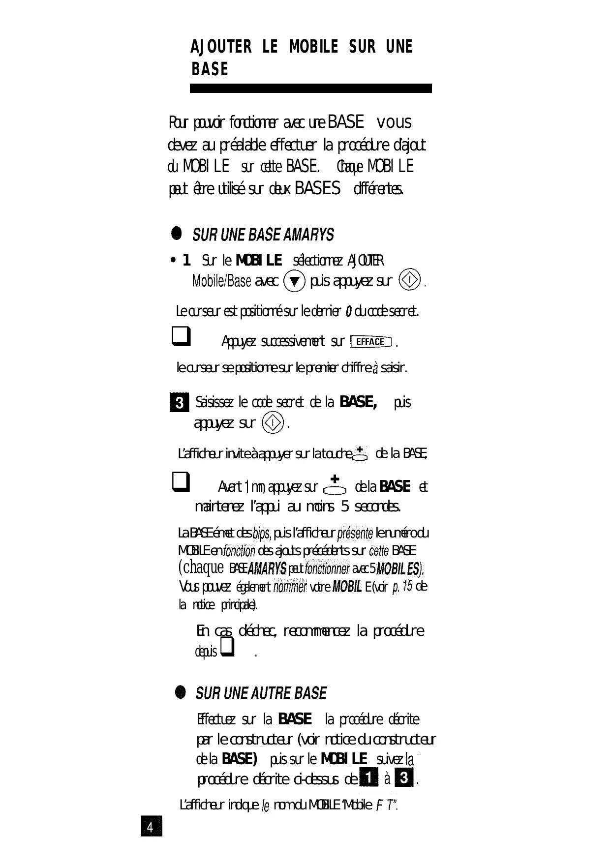 Pour pouvoir fonctionner avec une BASE, vous devez au préalable effectuer la procédure d'ajout du MOBILE sur cette BASE. Chaque MOBILE peut être utilisé sur deux BASES différentes.