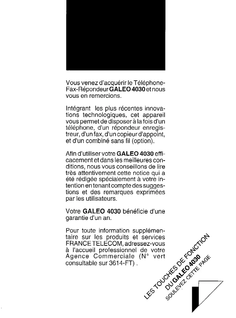 Vous venez d’acquérir le TéléphoneFax-Répondeur GALE0 4030 et nous vous en remercions. Intégrant les plus récentes innovations technologiques, cet appareil vous permet de disposer à la fois d’un téléphone, d’un répondeur enregistreur, d’un fax, d’un copieur d’appoint, et d’un combiné sans fil (option). Afin d’utiliser votre GALE0 4030 efficacement et dans les meilleures conditions, nous vous conseillons de lire très attentivement cette notice qui a été rédigée spécialement à votre intention en tenant compte des suggestions et des remarques exprimées par les utilisateurs. Votre GALE0 4030 bénéficie garantie d’un an. d’une Pour toute information supplémentaire sur les produits et services FRANCETELECOM, adressez-vous à l’accueil professionnel de votre Agence Commerciale (N” vert consultable sur 3614-FT)
