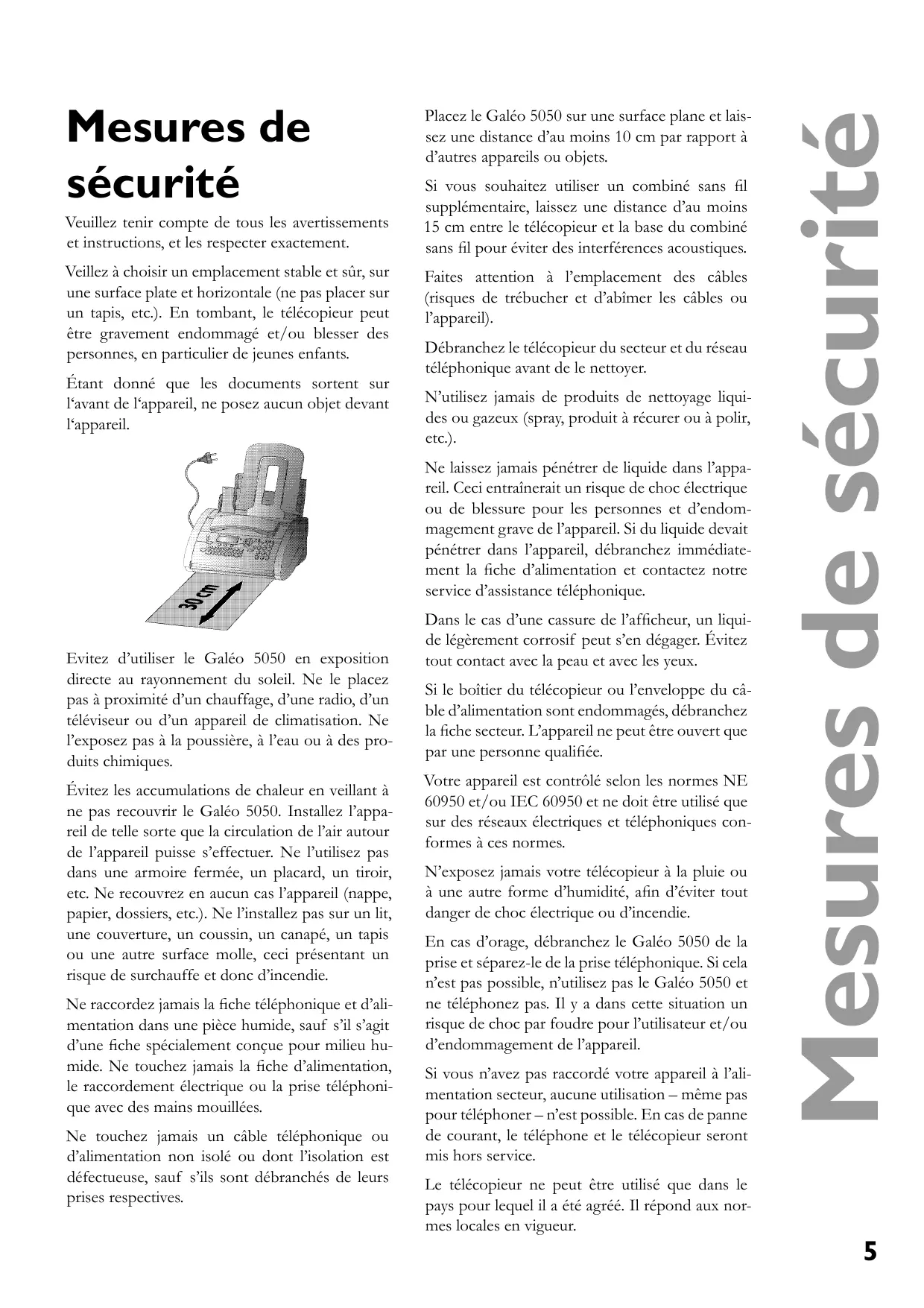 Évitez les accumulations de chaleur en veillant à ne pas recouvrir le Galéo 5050. Installez l'appareil de telle sorte que la circulation de l'air autour de l'appareil puisse s'effectuer. Ne l'utilisez pas dans une armoire fermée, un placard, un tiroir, etc. Ne recouvrez en aucun cas l'appareil (nappe, papier, dossiers, etc.). Ne l'installez pas sur un lit, une couverture, un coussin, un canapé, un tapis ou une autre surface molle, ceci présentant un risque de surchauffe et donc d'incendie.