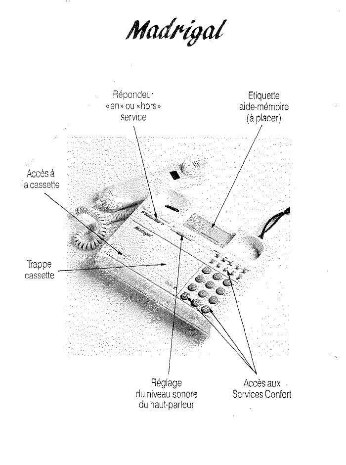 Accès à la casselie Réglage du niveau sonore du haut-parleur Accès aux Servtces Confort LES MUlTIPlES SWIBllITES VOTREMADRIGAL Mettre en service le Madrigal Vous venez d’acquérir un téléphone-répondeur MADRIGAL auprès de Regler la sonnerie FRANCE TELECOM. Cet appareil a étéconçu pour Enregistrer vous assurer une utilisation votre annonce complète du téléphone PUISque c’est en même temps un Mettre en service poste téléphoniquehaut de le répondeur gamme et un répondeurEcouter les messages 6 enregistreur interrogeableà drstance doté de perfectronIr; terroger à dis tance 7 nements nouveaux. La lecture de cette brochure vous permettra d’utrlrser facileLQiliser le Madrigal ert répondeur simple 10 ment toutes les possibilités de votre MADRIGAL. Aopeler sans décrocher 16% combiné
