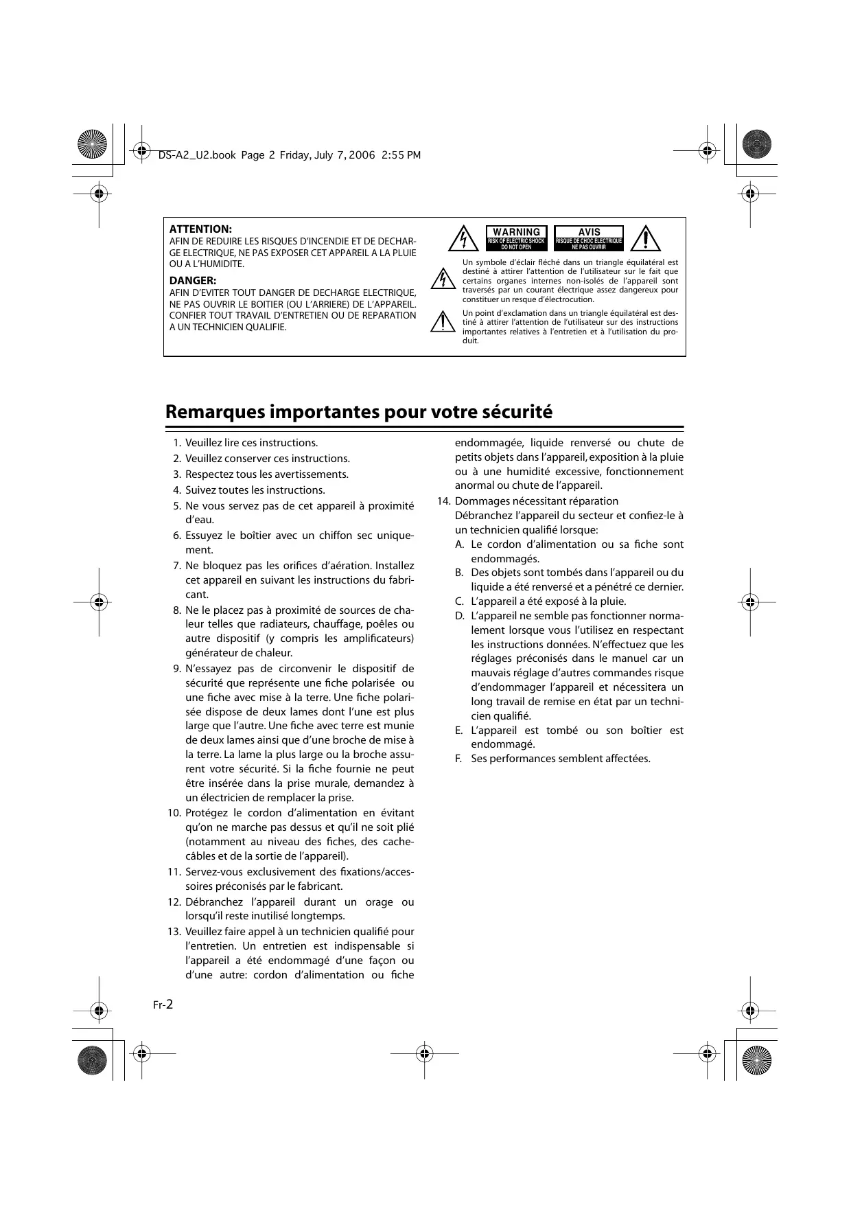14. Dommages nécessitant réparation Débranchez l’appareil du secteur et confiez-le à un technicien qualifié lorsque: A. Le cordon d’alimentation ou sa fiche sont endommagés. B. Des objets sont tombés dans l’appareil ou du liquide a été renversé et a pénétré ce dernier. C. L’appareil a été exposé à la pluie. D. L’appareil ne semble pas fonctionner normalement lorsque vous l’utilisez en respectant les instructions données. N’effectuez que les réglages préconisés dans le manuel car un mauvais réglage d’autres commandes risque d’endommager l’appareil et nécessitera un long travail de remise en état par un technicien qualifié. E. L’appareil est tombé ou son boîtier est endommagé. F. Ses performances semblent affectées.