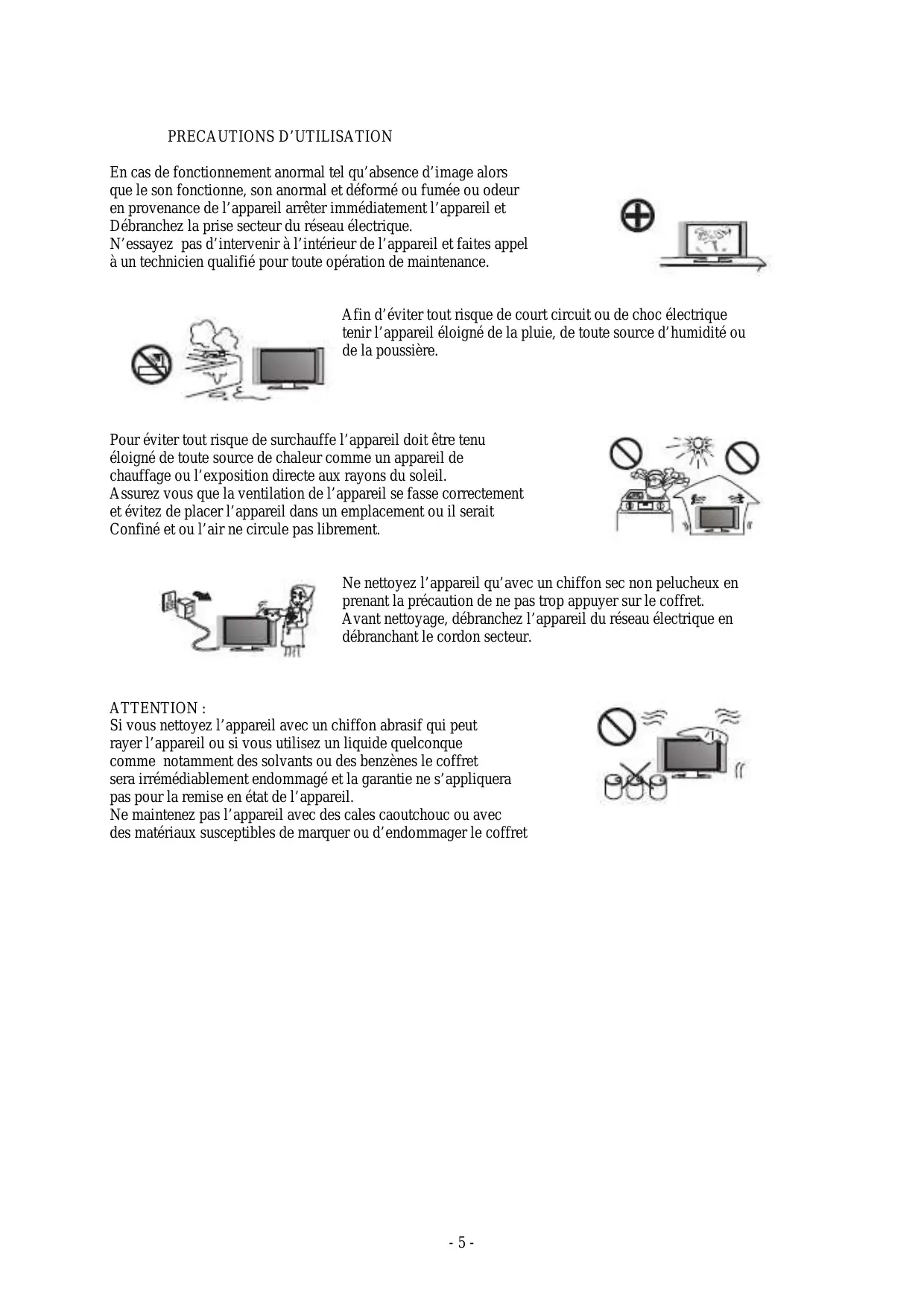 En cas de fonctionnement anormal tel qu'absence d'image alors que le son fonctionne, son anormal et déformé ou fumée ou odeur en provenance de l'appareil arrêter immidiatement l'appareil et Debranchez la prise secteur du réseau électrique. N'essayez pas d'intervenir à l'intérieur de l'appareil et faites appel à un technicien qualifié pour toute opération de maintenance.