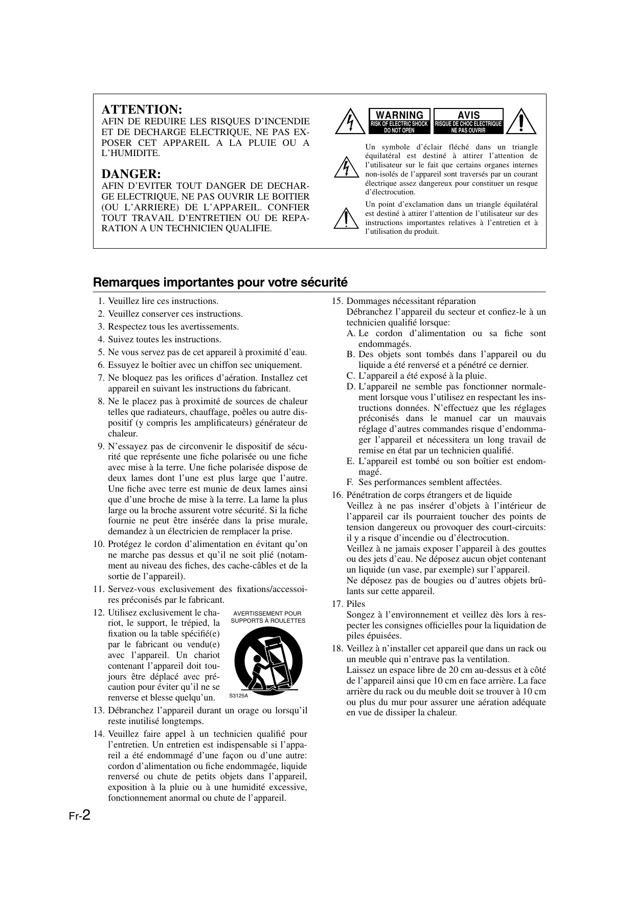 Veuillez conserver ces instructions. Respectez tous les avertissements. Suivez toutes les instructions. Ne vous servez pas de cet appareil à proximité d’eau. Essuyez le boîtier avec un chiffon sec uniquement. Ne bloquez pas les orifices d’aération. Installez cet appareil en suivant les instructions du fabricant. Ne le placez pas à proximité de sources de chaleur telles que radiateurs, chauffage, poêles ou autre dispositif (y compris les amplificateurs) générateur de chaleur. N’essayez pas de circonvenir le dispositif de sécurité que représente une fiche polarisée ou une fiche avec mise à la terre. Une fiche polarisée dispose de deux lames dont l’une est plus large que l’autre. Une fiche avec terre est munie de deux lames ainsi que d’une broche de mise à la terre. La lame la plus large ou la broche assurent votre sécurité. Si la fiche fournie ne peut être insérée dans la prise murale, demandez à un électricien de remplacer la prise. Protégez le cordon d’alimentation en évitant qu’on ne marche pas dessus et qu’il ne soit plié (notamment au niveau des fiches, des cache-câbles et de la sortie de l’appareil). Servez-vous exclusivement des fixations/accessoires préconisés par le fabricant. Utilisez exclusivement le cha- AVERTISSEMENT POUR riot, le support, le trépied, la SUPPORTS À ROULETTES fixation ou la table spécifié(e) par le fabricant ou vendu(e) avec l’appareil. Un chariot contenant l’appareil doit toujours être déplacé avec précaution pour éviter qu’il ne se renverse et blesse quelqu’un. S3125A Débranchez l’appareil durant un orage ou lorsqu’il reste inutilisé longtemps. Veuillez faire appel à un technicien qualifié pour l’entretien. Un entretien est indispensable si l’appareil a été endommagé d’une façon ou d’une autre: cordon d’alimentation ou fiche endommagée, liquide renversé ou chute de petits objets dans l’appareil, exposition à la pluie ou à une humidité excessive, fonctionnement anormal ou chute de l’appareil.