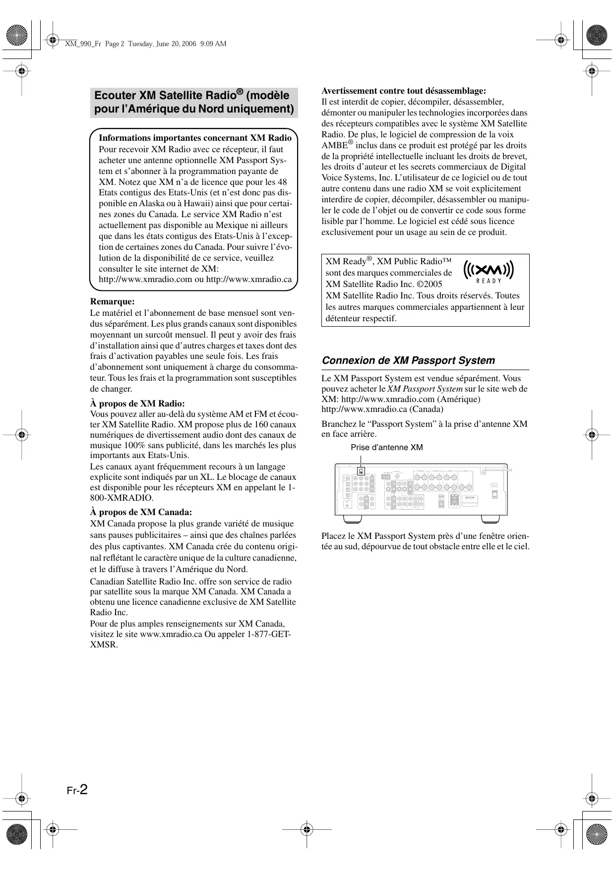 Ecouter XM Satellite Radio® (modèle pour l’Amérique du Nord uniquement) Informations importantes concernant XM Radio Pour recevoir XM Radio avec ce récepteur, il faut acheter une antenne optionnelle XM Passport System et s’abonner à la programmation payante de XM. Notez que XM n’a de licence que pour les 48 Etats contigus des Etats-Unis (et n’est donc pas disponible en Alaska ou à Hawaii) ainsi que pour certaines zones du Canada. Le service XM Radio n’est actuellement pas disponible au Mexique ni ailleurs que dans les états contigus des Etats-Unis à l’exception de certaines zones du Canada. Pour suivre l’évolution de la disponibilité de ce service, veuillez consulter le site internet de XM: http://www.xmradio.com ou http://www.xmradio.ca Remarque: Le matériel et l’abonnement de base mensuel sont vendus séparément. Les plus grands canaux sont disponibles moyennant un surcoût mensuel. Il peut y avoir des frais d’installation ainsi que d’autres charges et taxes dont des frais d’activation payables une seule fois. Les frais d’abonnement sont uniquement à charge du consommateur. Tous les frais et la programmation sont susceptibles de changer. À propos de XM Radio: Vous pouvez aller au-delà du système AM et FM et écouter XM Satellite Radio. XM propose plus de 160 canaux numériques de divertissement audio dont des canaux de musique 100% sans publicité, dans les marchés les plus importants aux Etats-Unis. Les canaux ayant fréquemment recours à un langage explicite sont indiqués par un XL. Le blocage de canaux est disponible pour les récepteurs XM en appelant le 1800-XMRADIO.