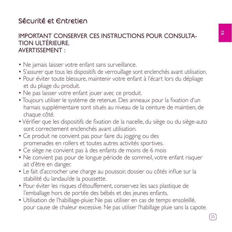 AVERTISSEMENT : • Ne jamais laisser votre enfant sans surveillance. • S’assurer que tous les dispositifs de verrouillage sont enclenchés avant utilisation. • Pour éviter toute blessure, maintenir votre enfant à l’écart lors du dépliage et du pliage du produit. • Ne pas laisser votre enfant jouer avec ce produit. • Toujours utiliser le système de retenue. Des anneaux pour la fixation d’un harnais supplémentaire sont situés au niveau de la ceinture de maintien, de chaque côté. • Vérifier que les dispositifs de fixation de la nacelle, du siège ou du siège-auto sont correctement enclenchés avant utilisation. • Ce produit ne convient pas pour faire du jogging ou des promenades en rollers et toutes autres activités sportives. • Ce siège ne convient pas à des enfants de moins de 6 mois • Ne convient pas pour de longue période de sommeil, votre enfant risquer ait d’être en danger. • Le fait d’accrocher une charge au poussoir, dossier ou côtés influe sur la stabilité du landau/de la poussette. • Pour éviter les risques d’étouffement, conservez les sacs plastique de l’emballage hors de portée des bébés et des jeunes enfants. • Utilisation de l’habillage-pluie: Ne pas utiliser en cas de temps ensoleillé, pour cause de chaleur excessive. Ne pas utiliser l’habillage pluie sans la capote. 25