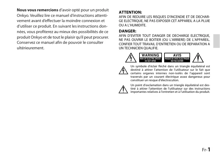 mouillées— Ne manipulez jamais cet appareil ou son cordon d'alimentation avec des mains moullées ou humides Si de l'eau ou tout autre liquide pénètre à l'intérieur de l'appareil faites-le vérifier par votre reven- deur Onkyo. 4. Remarques concernant la manipulation + Sivous devez transparter cet appareil servez-vous de l'emballage d'origine pour l'emballer comme i l'était lors de son acquisition. Ne posez pas d'objets en caoutchouc ou en plastique à demeure sur cet appareil cars risquent de lasser ‘des marques sur le boitier. Si vous n'utliez pas l'appareil durant une période assez longue, il risque de ne pas fonctionner convena- blement à la prochaine mise sous tension: veillez donc à l'utiliser de temps en temps.