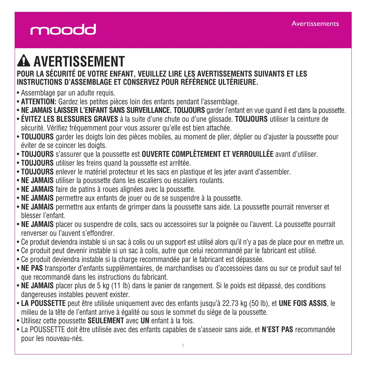 Avertissements AVERTISSEMENT POUR LA SÉCURITÉ DE VOTRE ENFANT, VEUILLEZ LIRE LES AVERTISSEMENTS SUIVANTS ET LES INSTRUCTIONS D’ASSEMBLAGE ET CONSERVEZ POUR RÉFÉRENCE ULTÉRIEURE.