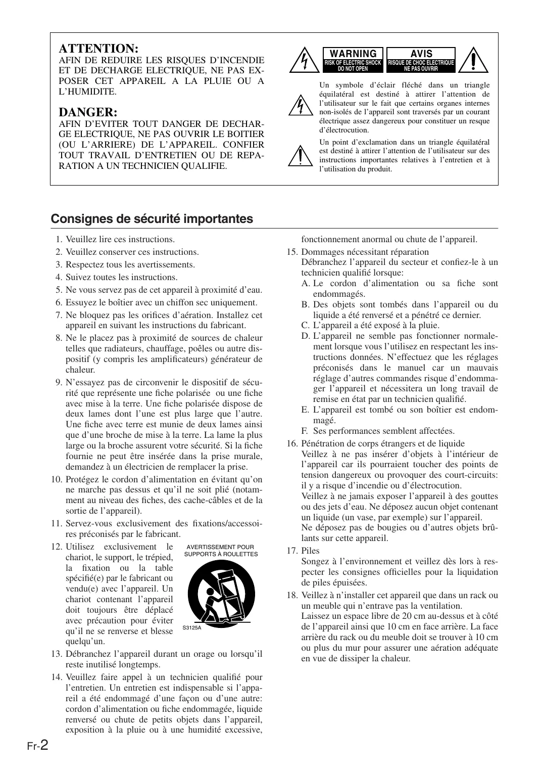Fr-2 Veuillez lire ces instructions. Veuillez conserver ces instructions. Respectez tous les avertissements. Suivez toutes les instructions. Ne vous servez pas de cet appareil à proximité d’eau. Essuyez le boîtier avec un chiffon sec uniquement. Ne bloquez pas les orifices d’aération. Installez cet appareil en suivant les instructions du fabricant. Ne le placez pas à proximité de sources de chaleur telles que radiateurs, chauffage, poêles ou autre dispositif (y compris les amplificateurs) générateur de chaleur. N’essayez pas de circonvenir le dispositif de sécurité que représente une fiche polarisée ou une fiche avec mise à la terre. Une fiche polarisée dispose de deux lames dont l’une est plus large que l’autre. Une fiche avec terre est munie de deux lames ainsi que d’une broche de mise à la terre. La lame la plus large ou la broche assurent votre sécurité. Si la fiche fournie ne peut être insérée dans la prise murale, demandez à un électricien de remplacer la prise. Protégez le cordon d’alimentation en évitant qu’on ne marche pas dessus et qu’il ne soit plié (notamment au niveau des fiches, des cache-câbles et de la sortie de l’appareil). Servez-vous exclusivement des fixations/accessoires préconisés par le fabricant. Utilisez exclusivement le AVERTISSEMENT POUR chariot, le support, le trépied, SUPPORTS À ROULETTES la fixation ou la table spécifié(e) par le fabricant ou vendu(e) avec l’appareil. Un chariot contenant l’appareil doit toujours être déplacé avec précaution pour éviter qu’il ne se renverse et blesse S3125A quelqu’un. Débranchez l’appareil durant un orage ou lorsqu’il reste inutilisé longtemps. Veuillez faire appel à un technicien qualifié pour l’entretien. Un entretien est indispensable si l’appareil a été endommagé d’une façon ou d’une autre: cordon d’alimentation ou fiche endommagée, liquide renversé ou chute de petits objets dans l’appareil, exposition à la pluie ou à une humidité excessive, fonctionnement anormal ou chute de l’appareil.