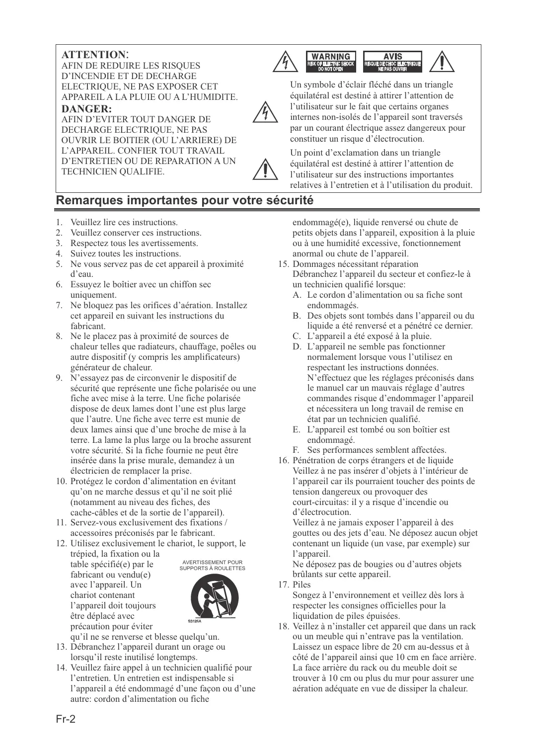 Veuillez lire ces instructions. Veuillez conserver ces instructions. Respectez tous les avertissements. Suivez toutes les instructions. Ne vous servez pas de cet appareil à proximité d’eau. Essuyez le boîtier avec un chiffon sec uniquement. Ne bloquez pas les orifices d’aération. Installez cet appareil en suivant les instructions du fabricant. Ne le placez pas à proximité de sources de chaleur telles que radiateurs, chauffage, poêles ou autre dispositif (y compris les amplificateurs) générateur de chaleur. N’essayez pas de circonvenir le dispositif de sécurité que représente une fiche polarisée ou une fiche avec mise à la terre. Une fiche polarisée dispose de deux lames dont l’une est plus large que l’autre. Une fiche avec terre est munie de deux lames ainsi que d’une broche de mise à la terre. La lame la plus large ou la broche assurent votre sécurité. Si la fiche fournie ne peut être insérée dans la prise murale, demandez à un électricien de remplacer la prise. Protégez le cordon d’alimentation en évitant qu’on ne marche dessus et qu’il ne soit plié (notamment au niveau des fiches, des cache-câbles et de la sortie de l’appareil). Servez-vous exclusivement des fixations / accessoires préconisés par le fabricant. Utilisez exclusivement le chariot, le support, le trépied, la fixation ou la AVERTISSEMENT POUR table spécifié(e) par le SUPPORTS À ROULETTES fabricant ou vendu(e) avec l’appareil. Un chariot contenant l’appareil doit toujours être déplacé avec précaution pour éviter qu’il ne se renverse et blesse quelqu’un. Débranchez l’appareil durant un orage ou lorsqu’il reste inutilisé longtemps. Veuillez faire appel à un technicien qualifié pour l’entretien. Un entretien est indispensable si l’appareil a été endommagé d’une façon ou d’une autre: cordon d’alimentation ou fiche Fr-2