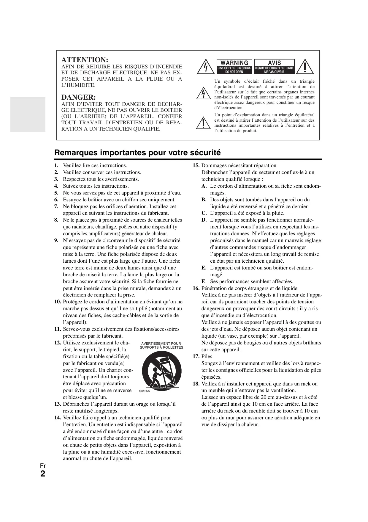 Veuillez conserver ces instructions. Respectez tous les avertissements. Suivez toutes les instructions. Ne vous servez pas de cet appareil à proximité d’eau. Essuyez le boîtier avec un chiffon sec uniquement. Ne bloquez pas les orifices d’aération. Installez cet appareil en suivant les instructions du fabricant. Ne le placez pas à proximité de sources de chaleur telles que radiateurs, chauffage, poêles ou autre dispositif (y compris les amplificateurs) générateur de chaleur. N’essayez pas de circonvenir le dispositif de sécurité que représente une fiche polarisée ou une fiche avec mise à la terre. Une fiche polarisée dispose de deux lames dont l’une est plus large que l’autre. Une fiche avec terre est munie de deux lames ainsi que d’une broche de mise à la terre. La lame la plus large ou la broche assurent votre sécurité. Si la fiche fournie ne peut être insérée dans la prise murale, demandez à un électricien de remplacer la prise. Protégez le cordon d’alimentation en évitant qu’on ne marche pas dessus et qu’il ne soit plié (notamment au niveau des fiches, des cache-câbles et de la sortie de l’appareil). Servez-vous exclusivement des fixations/accessoires préconisés par le fabricant. Utilisez exclusivement le chaAVERTISSEMENT POUR SUPPORTS À ROULETTES riot, le support, le trépied, la fixation ou la table spécifié(e) par le fabricant ou vendu(e) avec l’appareil. Un chariot contenant l’appareil doit toujours être déplacé avec précaution pour éviter qu’il ne se renverse S3125A et blesse quelqu’un. Débranchez l’appareil durant un orage ou lorsqu’il reste inutilisé longtemps. Veuillez faire appel à un technicien qualifié pour l’entretien. Un entretien est indispensable si l’appareil a été endommagé d’une façon ou d’une autre : cordon d’alimentation ou fiche endommagée, liquide renversé ou chute de petits objets dans l’appareil, exposition à la pluie ou à une humidité excessive, fonctionnement anormal ou chute de l’appareil.