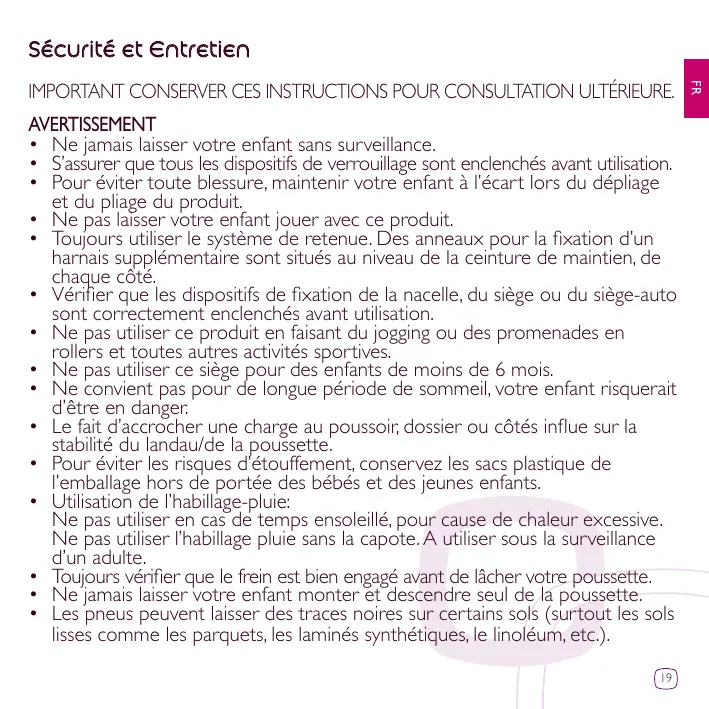 AVERTISSEMENT • Ne jamais laisser votre enfant sans surveillance. • S’assurer que tous les dispositifs de verrouillage sont enclenchés avant utilisation. • Pour éviter toute blessure, maintenir votre enfant à l’écart lors du dépliage et du pliage du produit. • Ne pas laisser votre enfant jouer avec ce produit. • Toujours utiliser le système de retenue. Des anneaux pour la fixation d’un harnais supplémentaire sont situés au niveau de la ceinture de maintien, de chaque côté. • Vérifier que les dispositifs de fixation de la nacelle, du siège ou du siège-auto sont correctement enclenchés avant utilisation. • Ne pas utiliser ce produit en faisant du jogging ou des promenades en rollers et toutes autres activités sportives. • Ne pas utiliser ce siège pour des enfants de moins de 6 mois. • Ne convient pas pour de longue période de sommeil, votre enfant risquerait d’être en danger. • Le fait d’accrocher une charge au poussoir, dossier ou côtés influe sur la stabilité du landau/de la poussette. • Pour éviter les risques d’étouffement, conservez les sacs plastique de l’emballage hors de portée des bébés et des jeunes enfants. • Utilisation de l’habillage-pluie: Ne pas utiliser en cas de temps ensoleillé, pour cause de chaleur excessive. Ne pas utiliser l’habillage pluie sans la capote. A utiliser sous la surveillance d’un adulte. • Toujours vérifier que le frein est bien engagé avant de lâcher votre poussette. • Ne jamais laisser votre enfant monter et descendre seul de la poussette. • Les pneus peuvent laisser des traces noires sur certains sols (surtout les sols lisses comme les parquets, les laminés synthétiques, le linoléum, etc.). 19