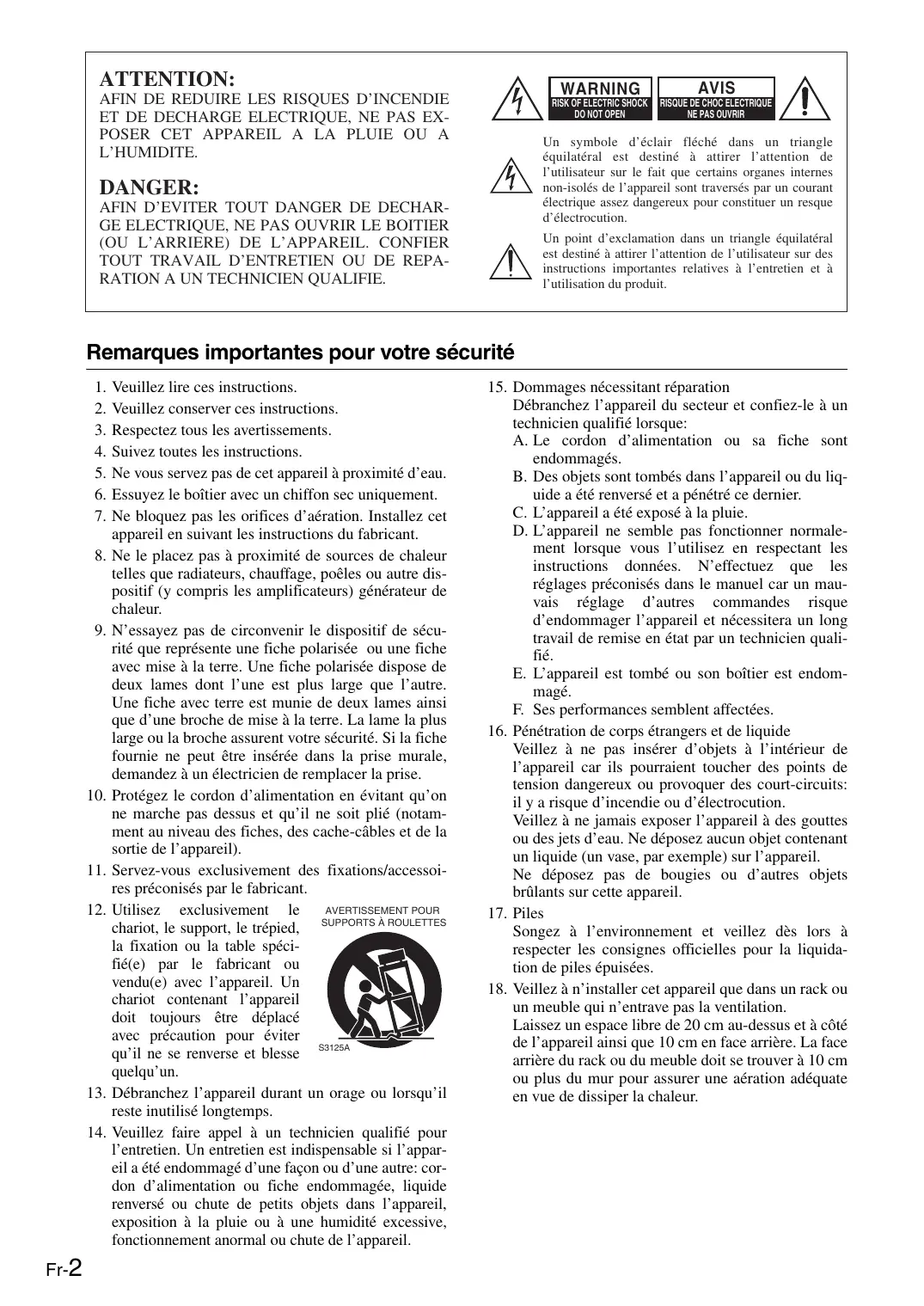 Veuillez conserver ces instructions. Respectez tous les avertissements. Suivez toutes les instructions. Ne vous servez pas de cet appareil à proximité d’eau. Essuyez le boîtier avec un chiffon sec uniquement. Ne bloquez pas les orifices d’aération. Installez cet appareil en suivant les instructions du fabricant. Ne le placez pas à proximité de sources de chaleur telles que radiateurs, chauffage, poêles ou autre dispositif (y compris les amplificateurs) générateur de chaleur. N’essayez pas de circonvenir le dispositif de sécurité que représente une fiche polarisée ou une fiche avec mise à la terre. Une fiche polarisée dispose de deux lames dont l’une est plus large que l’autre. Une fiche avec terre est munie de deux lames ainsi que d’une broche de mise à la terre. La lame la plus large ou la broche assurent votre sécurité. Si la fiche fournie ne peut être insérée dans la prise murale, demandez à un électricien de remplacer la prise. Protégez le cordon d’alimentation en évitant qu’on ne marche pas dessus et qu’il ne soit plié (notamment au niveau des fiches, des cache-câbles et de la sortie de l’appareil). Servez-vous exclusivement des fixations/accessoires préconisés par le fabricant. AVERTISSEMENT POUR Utilisez exclusivement le chariot, le support, le trépied, SUPPORTS À ROULETTES la fixation ou la table spécifié(e) par le fabricant ou vendu(e) avec l’appareil. Un chariot contenant l’appareil doit toujours être déplacé avec précaution pour éviter qu’il ne se renverse et blesse S3125A quelqu’un. Débranchez l’appareil durant un orage ou lorsqu’il reste inutilisé longtemps. Veuillez faire appel à un technicien qualifié pour l’entretien. Un entretien est indispensable si l’appareil a été endommagé d’une façon ou d’une autre: cordon d’alimentation ou fiche endommagée, liquide renversé ou chute de petits objets dans l’appareil, exposition à la pluie ou à une humidité excessive, fonctionnement anormal ou chute de l’appareil.