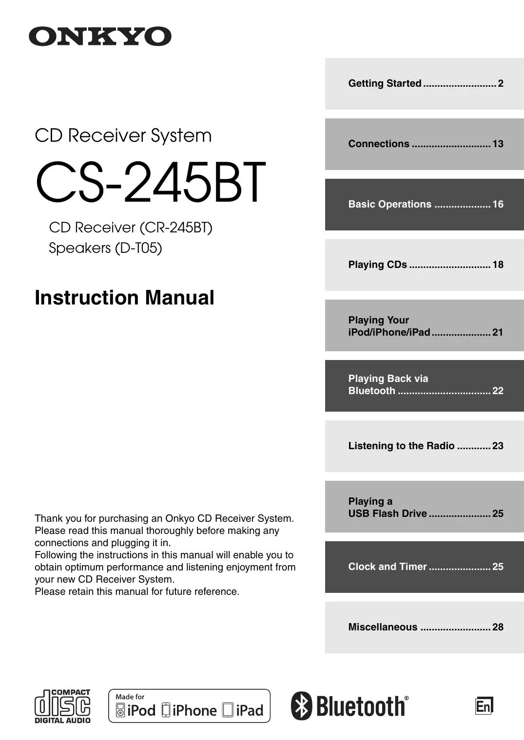 Retrouvez gratuitement la notice de l'appareil CS-245BT ONKYO au format PDF.