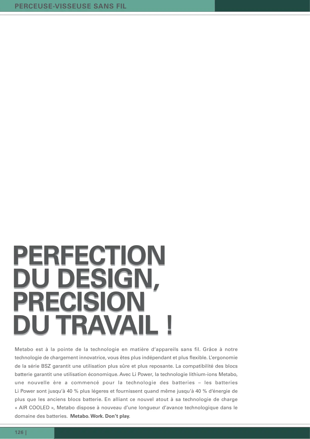 PERCEUSE-VISSEUSE SANS FIL PERFECTION DU DESIGN, PRECISION DU TRAVAIL ! Metabo est à la pointe de la technologie en matière d‘appareils sans fil. Grâce à notre technologie de chargement innovatrice, vous êtes plus indépendant et plus flexible. L’ergonomie de la série BSZ garantit une utilisation plus sûre et plus reposante. La compatibilité des blocs batterie garantit une utilisation économique. Avec Li Power, la technologie lithium-ions Metabo, une nouvelle ère a commencé pour la technologie des batteries – les batteries Li Power sont jusqu‘à 40 % plus légeres et fournissent quand même jusqu‘à 40 % d‘énergie de plus que les anciens blocs batterie. En alliant ce nouvel atout à sa technologie de charge « AIR COOLED », Metabo dispose à nouveau d’une longueur d’avance technologique dans le domaine des batteries. Metabo. Work. Don’t play. 126 |