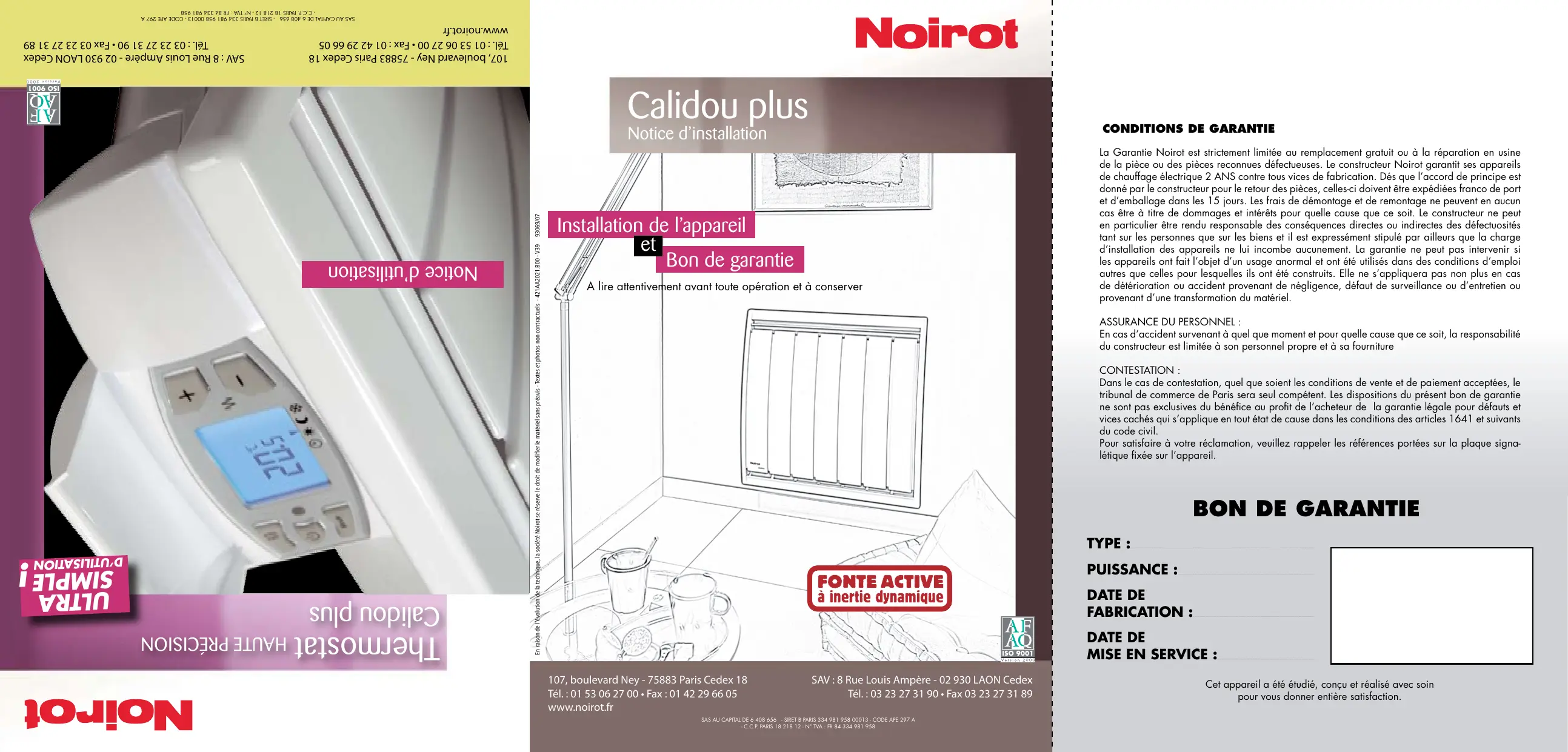 - Le symbole Auto clignote : l’appareil reçoit un ordre «Hors-gel» ou «Arrêt chauffage» selon l’affichage. Page 10 SAS au Capital de 6 408 656 € - SIRET B PARIS 334 981 958 00013 - Code APE 297 A - C.C.P. PARIS 18 218 12 - N° TVA : FR 84 334 981 958 107, boulevard Ney - 75883 Paris Cedex 18 Tél. : 01 53 06 27 00 • Fax : 01 42 29 66 05 www.noirot.fr SAV : 8 Rue Louis Ampère - 02 930 LAON Cedex Tél. : 03 23 27 31 90 • Fax 03 23 27 31 89 Calidou plus