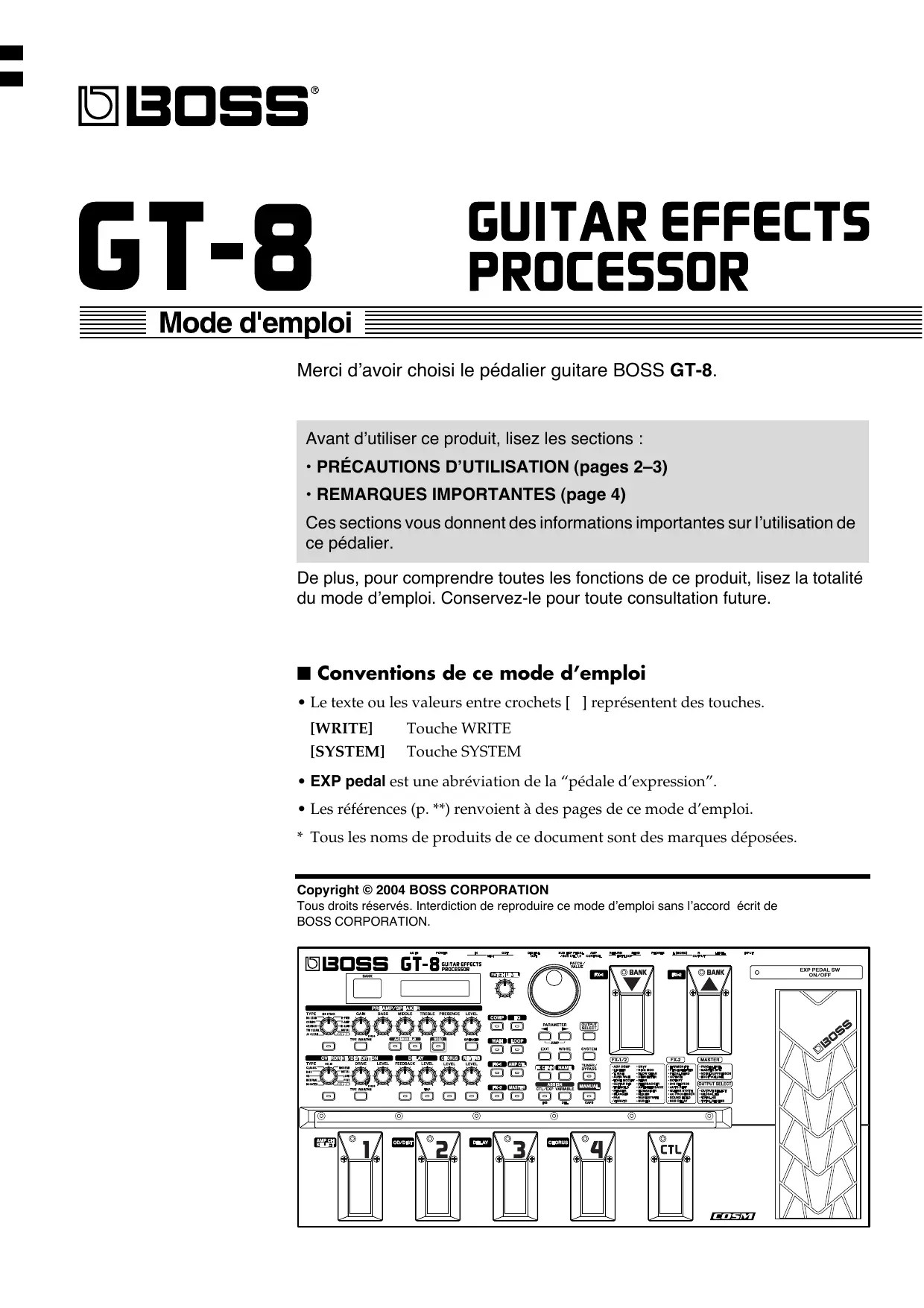 Merci d’avoir choisi le pédalier guitare BOSS GT-8. Avant d’utiliser ce produit, lisez les sections :