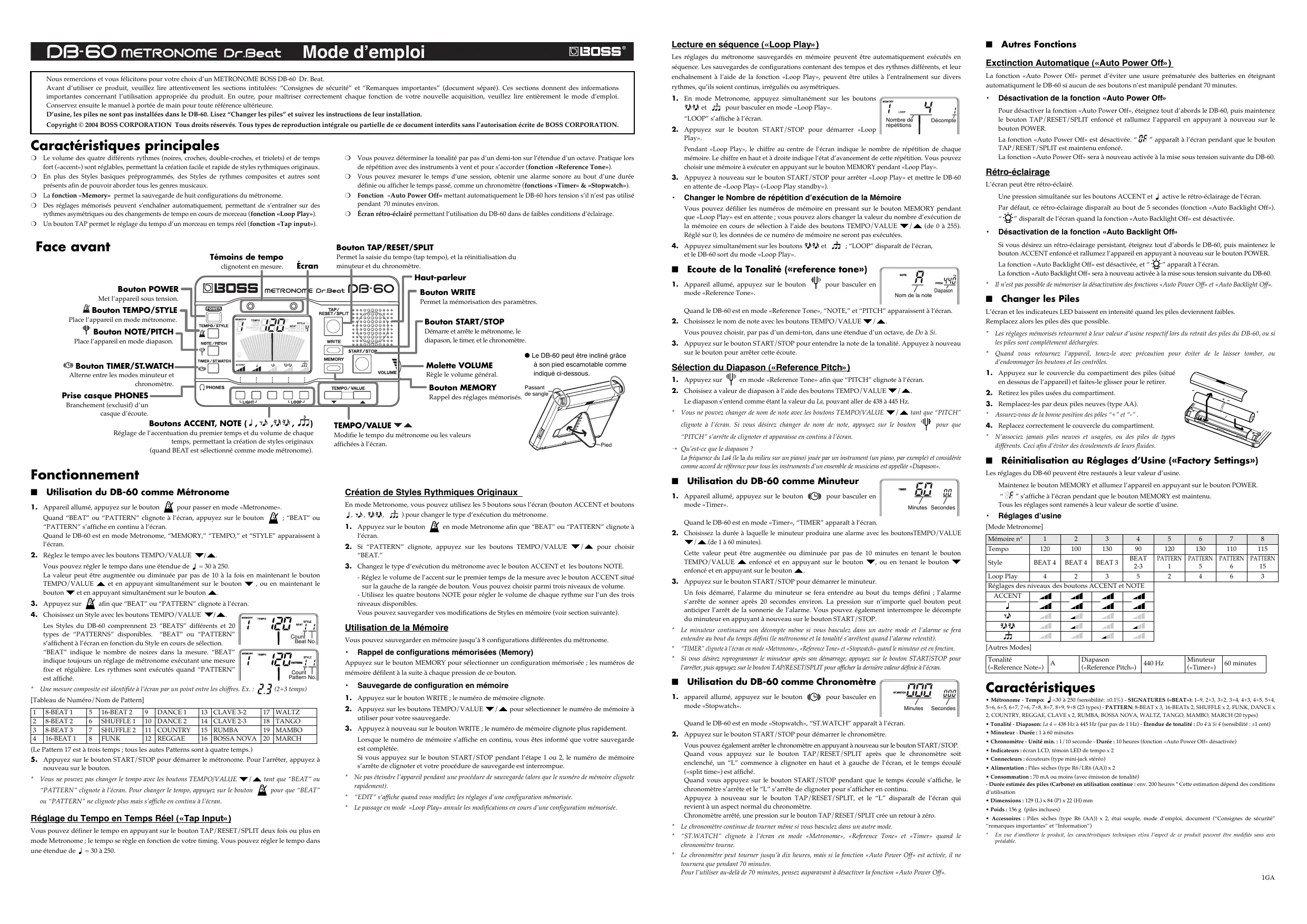 Lecture en séquence («Loop Play») Mode dʼemploi Nous remercions et vous félicitons pour votre choix d’un METRONOME BOSS DB-60 Dr. Beat. Avant d’utiliser ce produit, veuillez lire attentivement les sections intitulées: “Consignes de sécurité” et “Remarques importantes” (document séparé). Ces sections donnent des informations importantes concernant l’utilisation appropriée du produit. En outre, pour maîtriser correctement chaque fonction de votre nouvelle acquisition, veuillez lire entièrement le mode d’emploi. Conservez ensuite le manuel à portée de main pour toute référence ultérieure. D’usine, les piles ne sont pas installées dans le DB-60. Lisez “Changer les piles” et suivez les instructions de leur installation. Copyright © 2004 BOSS CORPORATION Tous droits réservés. Tous types de reproduction intégrale ou partielle de ce document interdits sans l’autorisation écrite de BOSS CORPORATION. Caractéristiques principales Les réglages du métronome sauvegardés en mémoire peuvent être automatiquement exécutés en séquence. Les sauvegardes de configurations contenant des tempos et des rythmes différents, et leur enchaînement à l’aide de la fonction «Loop Play», peuvent être utiles à l’entraînement sur divers rythmes, qu’ils soient continus, irréguliés ou asymétriques. “LOOP” s’affiche à l’écran.