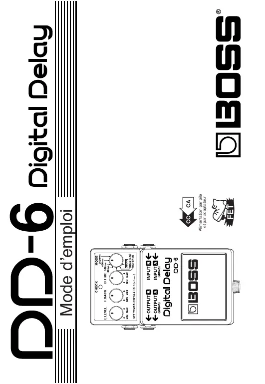 - Valeurs variables selon le mode sélectionné et les connexions. Bruit résiduel ................................... -90 dBu (mesure IHF-A, Type) : Réglages au centre Réglages............................................ Commutateur au pied, E.LEVEL , F.BACK , D.TIME , sélecteur MODE Témoin.............................................. CHECK (indique les modes TEMPO, HOLD, WARP, et l’état de la pile) Connecteurs ..................................... Jack INPUT-A (MONO), Jack INPUT-B, Jack OUTPUT-A (MONO), Jack OUTPUT-B, embase d’alimentation par adaptateur (9 Vcc) Alimentation.................................... 9 Vcc : Pile (9 V) S-006P/9 V (6F22/9 V) Pile (9 V) 6AM6/9 V (alcaline) Adaptateur secteur DD-6 : Délai numérique Caractéristiques