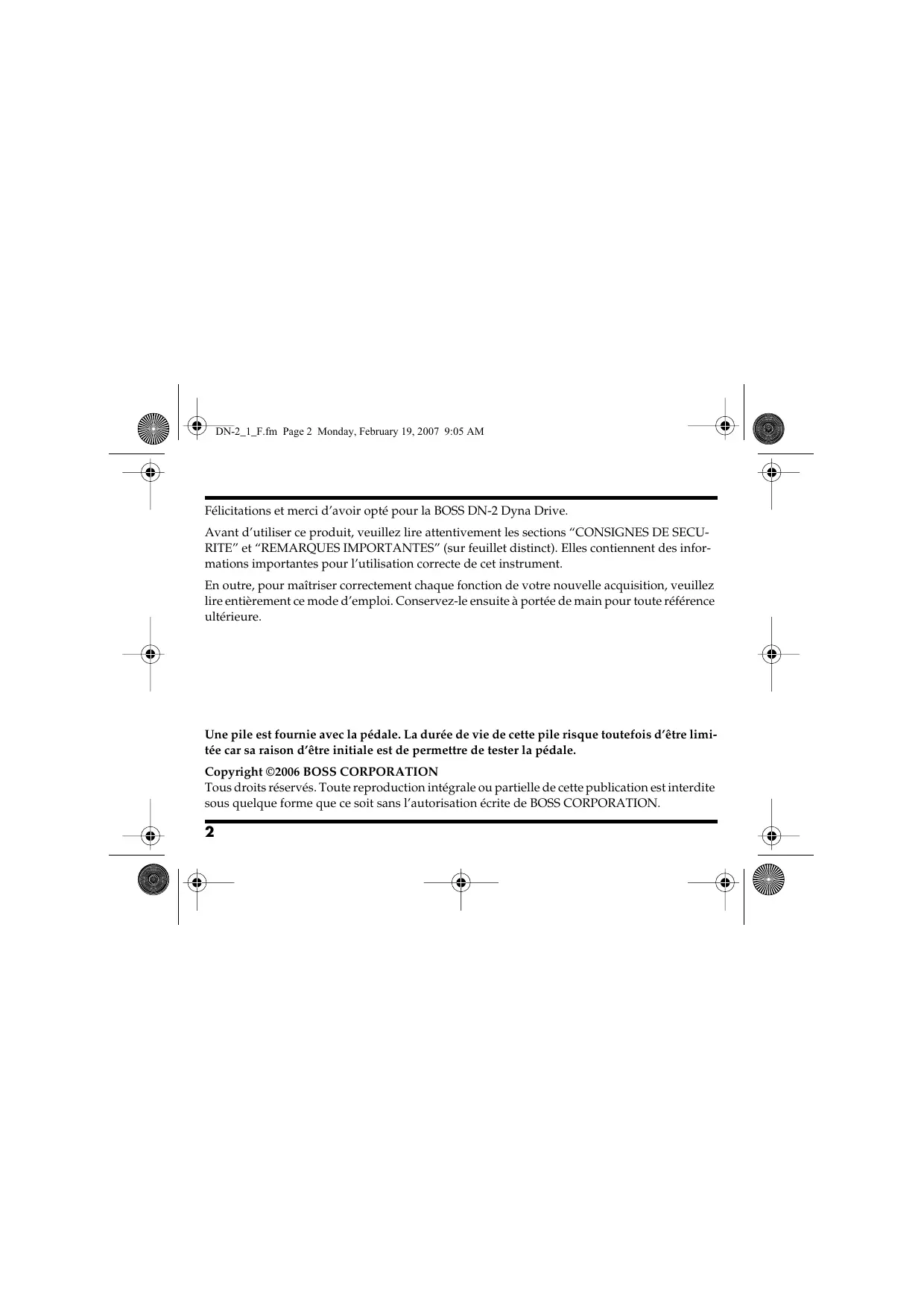 Alimentation par pile & adaptateur FET DN-2_1_F.fm Page 2 Monday, February 19, 2007 9:05 AM Félicitations et merci d’avoir opté pour la BOSS DN-2 Dyna Drive. Avant d’utiliser ce produit, veuillez lire attentivement les sections “CONSIGNES DE SECURITE” et “REMARQUES IMPORTANTES” (sur feuillet distinct). Elles contiennent des informations importantes pour l’utilisation correcte de cet instrument. En outre, pour maîtriser correctement chaque fonction de votre nouvelle acquisition, veuillez lire entièrement ce mode d’emploi. Conservez-le ensuite à portée de main pour toute référence ultérieure. Une pile est fournie avec la pédale. La durée de vie de cette pile risque toutefois d’être limitée car sa raison d’être initiale est de permettre de tester la pédale. Copyright ©2006 BOSS CORPORATION Tous droits réservés. Toute reproduction intégrale ou partielle de cette publication est interdite sous quelque forme que ce soit sans l’autorisation écrite de BOSS CORPORATION.