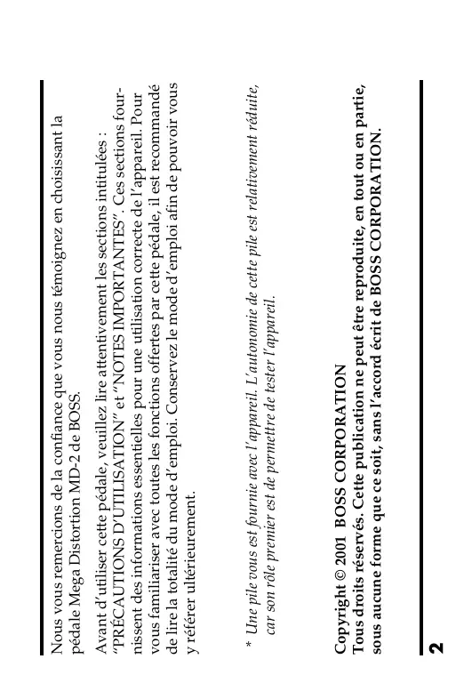 - Une pile vous est fournie avec l’appareil. L’autonomie de cette pile est relativement réduite, car son rôle premier est de permettre de tester l’appareil. Avant d’utiliser cette pédale, veuillez lire attentivement les sections intitulées : “PRÉCAUTIONS D’UTILISATION” et “NOTES IMPORTANTES”. Ces sections fournissent des informations essentielles pour une utilisation correcte de l’appareil. Pour vous familiariser avec toutes les fonctions offertes par cette pédale, il est recommandé de lire la totalité du mode d’emploi. Conservez le mode d’emploi afin de pouvoir vous y référer ultérieurement. Nous vous remercions de la confiance que vous nous témoignez en choisissant la pédale Mega Distortion MD-2 de BOSS. ● Le potentiomètre “BOTTOM” vous permet quant à lui de créer des sonorités très riches dans les basses.