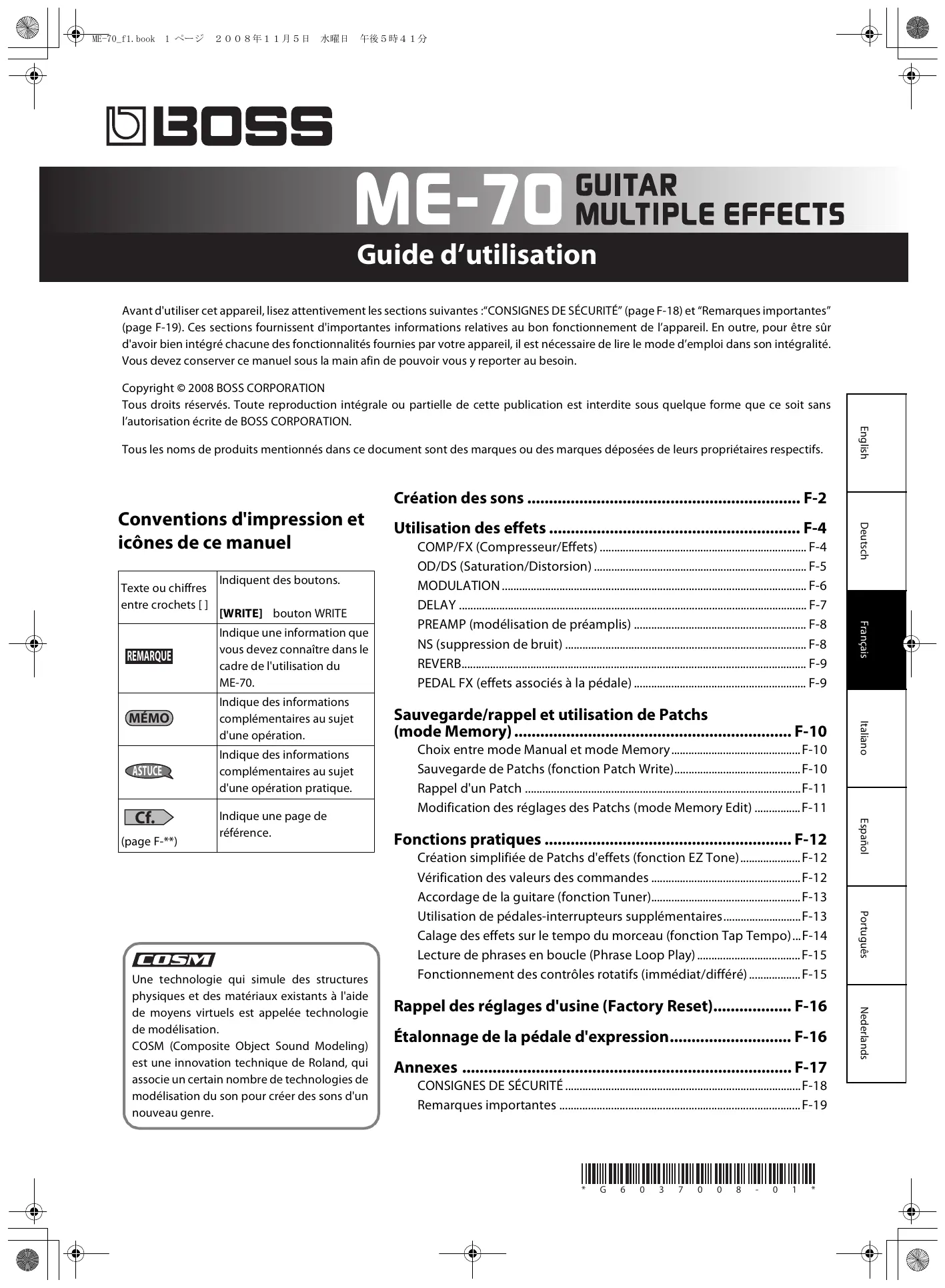 Tous les noms de produits mentionnés dans ce document sont des marques ou des marques déposées de leurs propriétaires respectifs. English Copyright © 2008 BOSS CORPORATION Tous droits réservés. Toute reproduction intégrale ou partielle de cette publication est interdite sous quelque forme que ce soit sans l’autorisation écrite de BOSS CORPORATION. Création des sons ............................................................... F-2 Texte ou chiffres entre crochets [ ] Indiquent des boutons. [WRITE] bouton WRITE Indique des informations complémentaires au sujet d'une opération. ASTUCE Indique des informations complémentaires au sujet d'une opération pratique. (page F-**) Indique une page de référence. Fonctions pratiques ......................................................... F-12 Création simplifiée de Patchs d'effets (fonction EZ Tone)..................... F-12 Vérification des valeurs des commandes .................................................... F-12 Accordage de la guitare (fonction Tuner).................................................... F-13 Utilisation de pédales-interrupteurs supplémentaires...........................F-13 Calage des effets sur le tempo du morceau (fonction Tap Tempo)...F-14 Lecture de phrases en boucle (Phrase Loop Play) .................................... F-15 Fonctionnement des contrôles rotatifs (immédiat/différé) .................. F-15 Rappel des réglages d'usine (Factory Reset).................. F-16 Português Une technologie qui simule des structures physiques et des matériaux existants à l'aide de moyens virtuels est appelée technologie de modélisation. COSM (Composite Object Sound Modeling) est une innovation technique de Roland, qui associe un certain nombre de technologies de modélisation du son pour créer des sons d'un nouveau genre. Choix entre mode Manual et mode Memory............................................. F-10 Sauvegarde de Patchs (fonction Patch Write)............................................ F-10 Rappel d'un Patch ................................................................................................F-11 Modification des réglages des Patchs (mode Memory Edit) ................ F-11 Español Cf. Sauvegarde/rappel et utilisation de Patchs (mode Memory) ................................................................ F-10 Italiano MÉMO Indique une information que vous devez connaître dans le cadre de l'utilisation du ME-70. Utilisation des effets .......................................................... F-4 Deutsch Conventions d'impression et icônes de ce manuel ME-70_f1.book 2 ページ 2008年11月5日