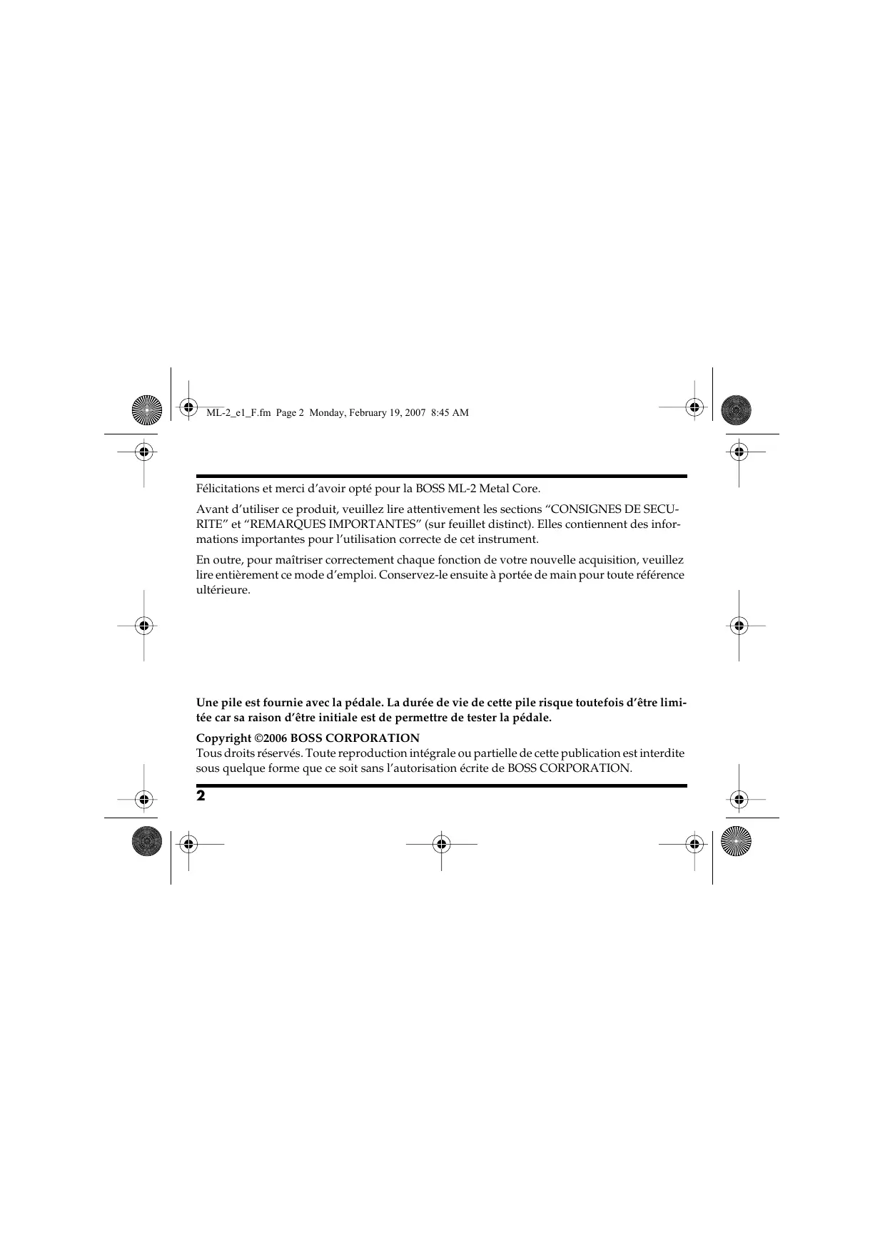 Alimentation par pile & adaptateur FET ML-2_e1_F.fm Page 2 Monday, February 19, 2007 8:45 AM Félicitations et merci d’avoir opté pour la BOSS ML-2 Metal Core. Avant d’utiliser ce produit, veuillez lire attentivement les sections “CONSIGNES DE SECURITE” et “REMARQUES IMPORTANTES” (sur feuillet distinct). Elles contiennent des informations importantes pour l’utilisation correcte de cet instrument. En outre, pour maîtriser correctement chaque fonction de votre nouvelle acquisition, veuillez lire entièrement ce mode d’emploi. Conservez-le ensuite à portée de main pour toute référence ultérieure. Une pile est fournie avec la pédale. La durée de vie de cette pile risque toutefois d’être limitée car sa raison d’être initiale est de permettre de tester la pédale. Copyright ©2006 BOSS CORPORATION Tous droits réservés. Toute reproduction intégrale ou partielle de cette publication est interdite sous quelque forme que ce soit sans l’autorisation écrite de BOSS CORPORATION.