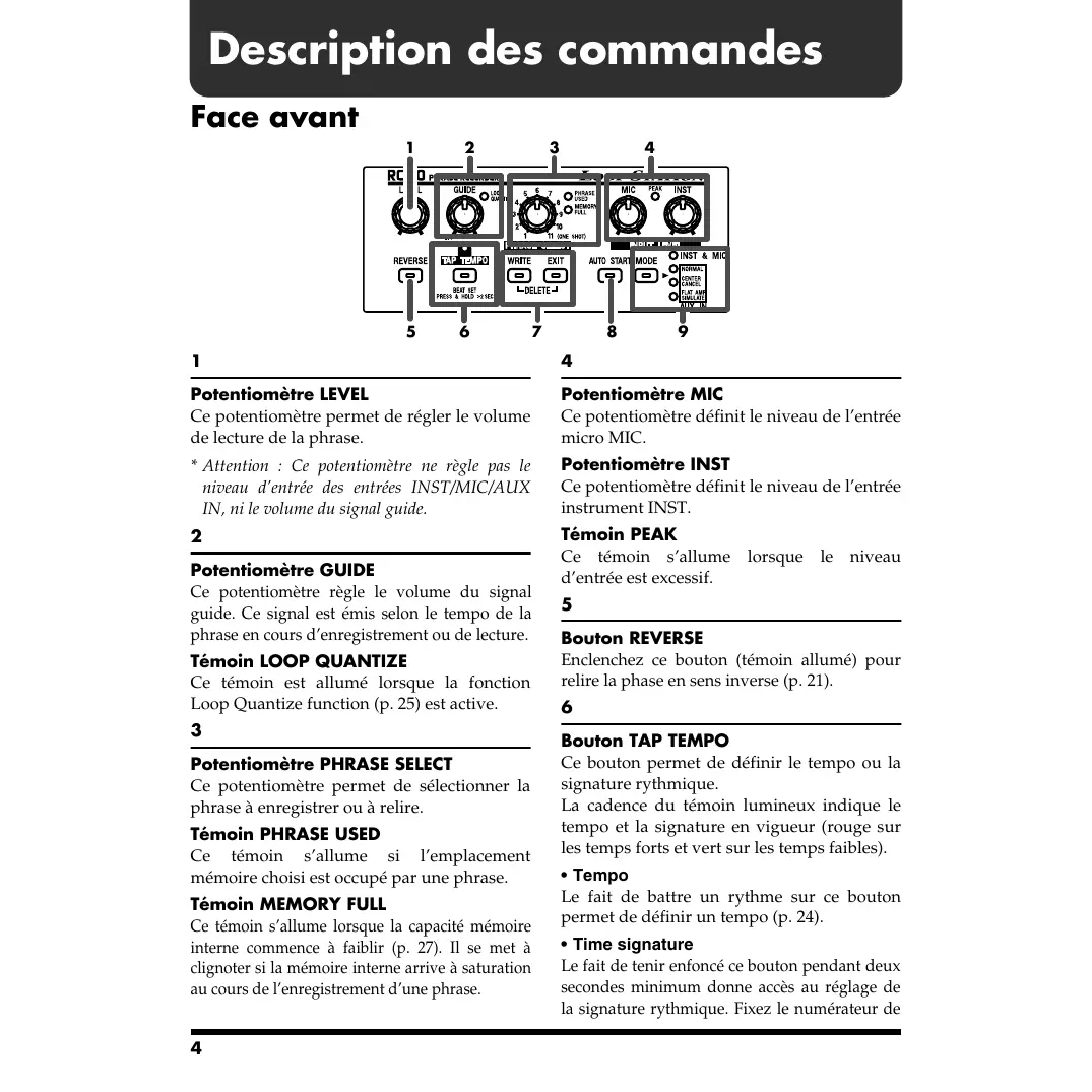 Témoin PEAK Ce témoin s’allume lorsque le niveau d’entrée est excessif. Potentiomètre GUIDE Ce potentiomètre règle le volume du signal guide. Ce signal est émis selon le tempo de la phrase en cours d’enregistrement ou de lecture. Témoin LOOP QUANTIZE Ce témoin est allumé lorsque la fonction Loop Quantize function (p. 25) est active. Potentiomètre PHRASE SELECT Ce potentiomètre permet de sélectionner la phrase à enregistrer ou à relire. Témoin PHRASE USED Ce témoin s’allume si l’emplacement mémoire choisi est occupé par une phrase. Témoin MEMORY FULL Ce témoin s’allume lorsque la capacité mémoire interne commence à faiblir (p. 27). Il se met à clignoter si la mémoire interne arrive à saturation au cours de l’enregistrement d’une phrase.