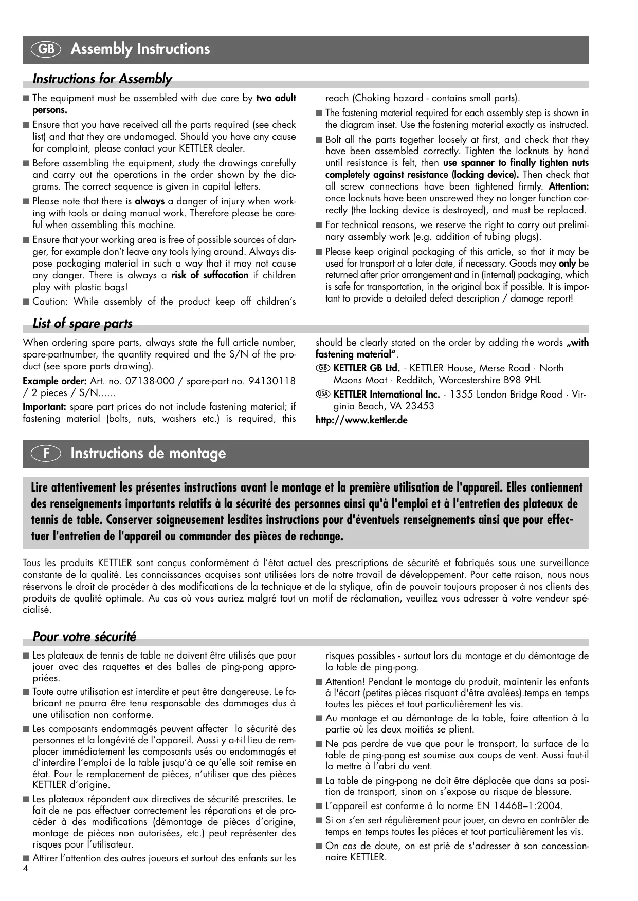should be clearly stated on the order by adding the words „with fastening material“. GB KETTLER GB Ltd. · KETTLER House, Merse Road · North Moons Moat · Redditch, Worcestershire B98 9HL USA KETTLER International Inc. · 1355 London Bridge Road · Virginia Beach, VA 23453 http://www.kettler.de Instructions de montage Lire attentivement les présentes instructions avant le montage et la première utilisation de l'appareil. Elles contiennent des renseignements importants relatifs à la sécurité des personnes ainsi qu'à l'emploi et à l'entretien des plateaux de tennis de table. Conserver soigneusement lesdites instructions pour d'éventuels renseignements ainsi que pour effectuer l'entretien de l'appareil ou commander des pièces de rechange. Tous les produits KETTLER sont conçus conformément à l’état actuel des prescriptions de sécurité et fabriqués sous une surveillance constante de la qualité. Les connaissances acquises sont utilisées lors de notre travail de développement. Pour cette raison, nous nous réservons le droit de procéder à des modifications de la technique et de la stylique, afin de pouvoir toujours proposer à nos clients des produits de qualité optimale. Au cas où vous auriez malgré tout un motif de réclamation, veuillez vous adresser à votre vendeur spécialisé. Pour votre sécurité I Les plateaux de tennis de table ne doivent être utilisés que pour