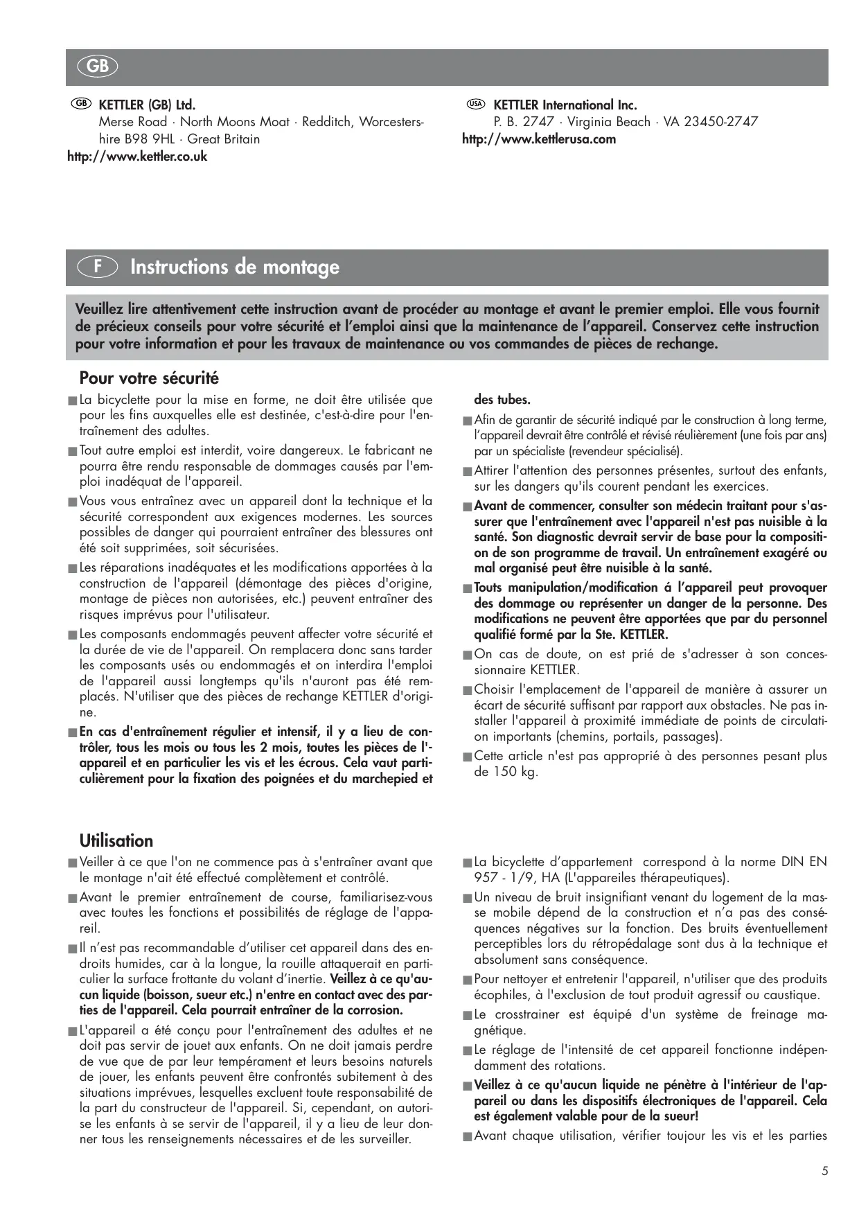 la durée de vie de l'appareil. On remplacera donc sans tarder les composants usés ou endommagés et on interdira l'emploi de l'appareil aussi longtemps qu'ils n'auront pas été remplacés. N'utiliser que des pièces de rechange KETTLER d'origine.