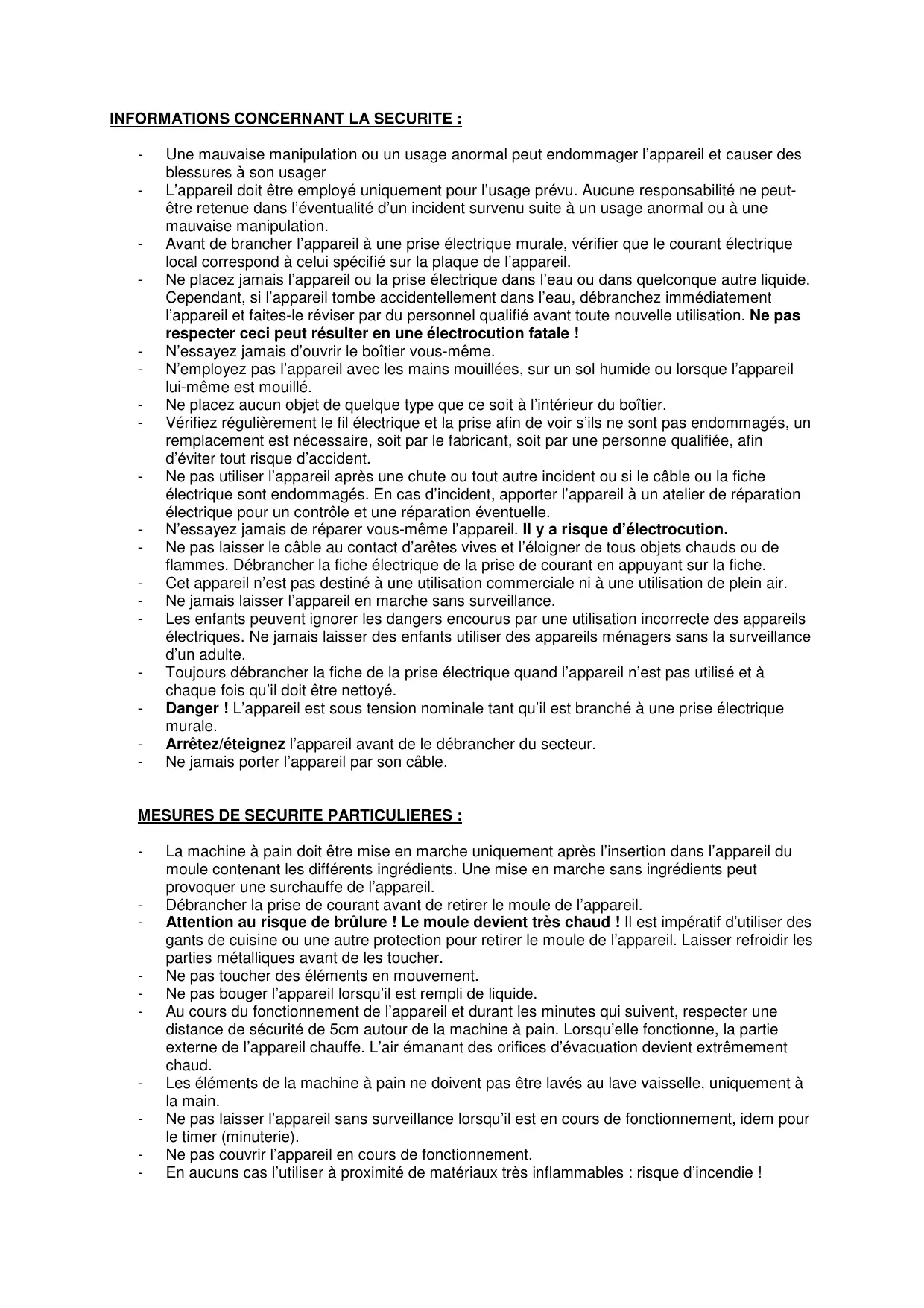 La machine à pain doit être mise en marche uniquement après l’insertion dans l’appareil du moule contenant les différents ingrédients. Une mise en marche sans ingrédients peut provoquer une surchauffe de l’appareil. Débrancher la prise de courant avant de retirer le moule de l’appareil. Attention au risque de brûlure ! Le moule devient très chaud ! Il est impératif d’utiliser des gants de cuisine ou une autre protection pour retirer le moule de l’appareil. Laisser refroidir les parties métalliques avant de les toucher. Ne pas toucher des éléments en mouvement. Ne pas bouger l’appareil lorsqu’il est rempli de liquide. Au cours du fonctionnement de l’appareil et durant les minutes qui suivent, respecter une distance de sécurité de 5cm autour de la machine à pain. Lorsqu’elle fonctionne, la partie externe de l’appareil chauffe. L’air émanant des orifices d’évacuation devient extrêmement chaud. Les éléments de la machine à pain ne doivent pas être lavés au lave vaisselle, uniquement à la main. Ne pas laisser l’appareil sans surveillance lorsqu’il est en cours de fonctionnement, idem pour le timer (minuterie). Ne pas couvrir l’appareil en cours de fonctionnement. En aucuns cas l’utiliser à proximité de matériaux très inflammables : risque d’incendie !