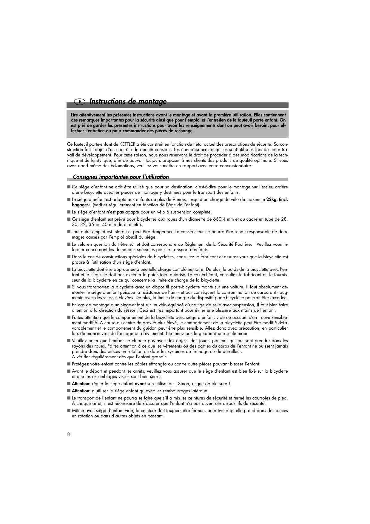Instructions de montage Lire attentivement les présentes instructions avant le montage et avant la première utilisation. Elles contiennent des remarques importantes pour la sécurité ainsi que pour l’emploi et l’entretien de le fauteuil porte-enfant. On est prié de garder les présentes instructions pour avoir les renseignements dont on peut avoir besoin, pour effectuer l’entretien ou pour commander des pièces de rechange. Ce fauteuil porte-enfant de KETTLER a été construit en fonction de l’état actuel des prescriptions de sécurité. Sa construction fait l’objet d’un contrôle de qualité constant. Les connaissances acquises sont utilisées lors de notre travail de développement. Pour cette raison, nous nous réservons le droit de procéder à des modifications de la technique et de la stylique, afin de pouvoir toujours proposer à nos clients des produits de qualité optimale. Si vous avez qand même des éclamations, veuillez vous mettre en rapport avec votre concessionnaire. Consignes importantes pour l’utilisation ■ Ce siège d’enfant ne doit être utilisé que pour sa destination, c’est-à-dire pour le montage sur l’essieu arrière d’une bicyclette avec les pièces de montage y destinées pour le transport des enfants. ■ Le siège d'enfant est adapté aux enfants de plus de 9 mois, jusqu'à un charge de vélo de maximum 22kg. (incl. bagages). (vérifier régulièrement en fonction de l’âge de l’enfant). ■ Le siège d’enfant n’est pas adapté pour un vélo à suspension complète. ■ Ce siège d’enfant est prévu pour bicyclettes aux roues d’un diamètre de 660,4 mm et au cadre en tube de 28, 30, 32, 35 ou 40 mm de diamètre. ■ Tout autre emploi est interdit et peut être dangereux. Le constructeur ne pourra être rendu responsable de dommages causés par l’emploi abusif du siège. ■ Le vélo en question doit être sür et doit correspondre au Réglement de la Sécurité Routière. Veuillez vous informer concernant les demandes spéciales pour le transport d’enfants. ■ Dans le cas de constructions spéciales de bicyclettes, consultez le fabricant et assurez-vous que la bicyclette est propre à l’utilisation d’un siège d’enfant. ■ La bicyclette doit être appropriée à une telle charge complémentaire. De plus, le poids de la bicyclette avec l’enfant et le siège ne doit pas excéder le poids total autorisé. Le cas échéant, consultez le fabricant ou le fournisseur de la bicyclette en ce qui concerne la limite de charge de la bicyclette. ■ Si vous transportez la bicyclette avec un dispositif porte-bicyclette monté sur une voiture, il faut absolument démonter le siège d'enfant puisque la résistance de l’air – et par conséquent la consommation de carburant - augmente avec des vitesses élevées. De plus, la limite de charge du dispositif porte-bicyclette pourrait être excédée. ■ En cas de montage d'un siège-enfant sur un vélo équipeé d’une tige de selle avec suspension, il faut bien faire attention à la direction du ressort. Ceci est très important pour éviter une blessure aux mains de l’enfant. ■ Faites attention que le comportement de la bicyclette avec siège d’enfant, vide ou occupé, s’en trouve sensiblement modifié. A cause du centre de gravité plus élevé, le comportement de la bicyclette peut être modifié défavorablement et le comportement du guidon peut être plus sensible. Allez donc avec précaution, en particulier lors de manœuvres de freinage ou d’évitement. Ne tenez pas le guidon à une seule main. ■ Veuillez noter que l’enfant ne chipote pas avec des objets (des jouets par ex.) qui puissent prendre dans les rayons des roues. Faites attention à ce que les vêtements ou des parties du corps de l’enfant ne puissent jamais prendre dans des pièces en rotation ou dans les systèmes de freinage ou de dérailleur. A vérifier régulièrement dès que l’enfant grandit. ■ Protégez votre enfant contre les câbles effrangés ou contre autre pièces pouvant blesser l’enfant. ■ Avant le départ et pendant les arrêts, veuillez vous assurer que le siège d’enfant est bien fixé sur la bicyclette et que les assemblages vissés sont bien serrés. ■ Attention: régler le siège enfant avant son utilisation ! Sinon, risque de blessure ! ■ Attention: n'utiliser le siège enfant qu'avec les rembourrages latéraux. ■ Le transport de l’enfant ne pourra se faire que s’il a mis les ceintures de sécurité et fermé les courroies de pied. A chaque arrêt, il est nécessaire de s’assurer que l’enfant n’a pas ouvert ces dispositifs de sécurité. ■ Même avec siège d’enfant vide, la ceinture doit toujours être fermée, pour éviter qu’elle prend dans des pièces en rotation ou dans d‘autres objets en passant.