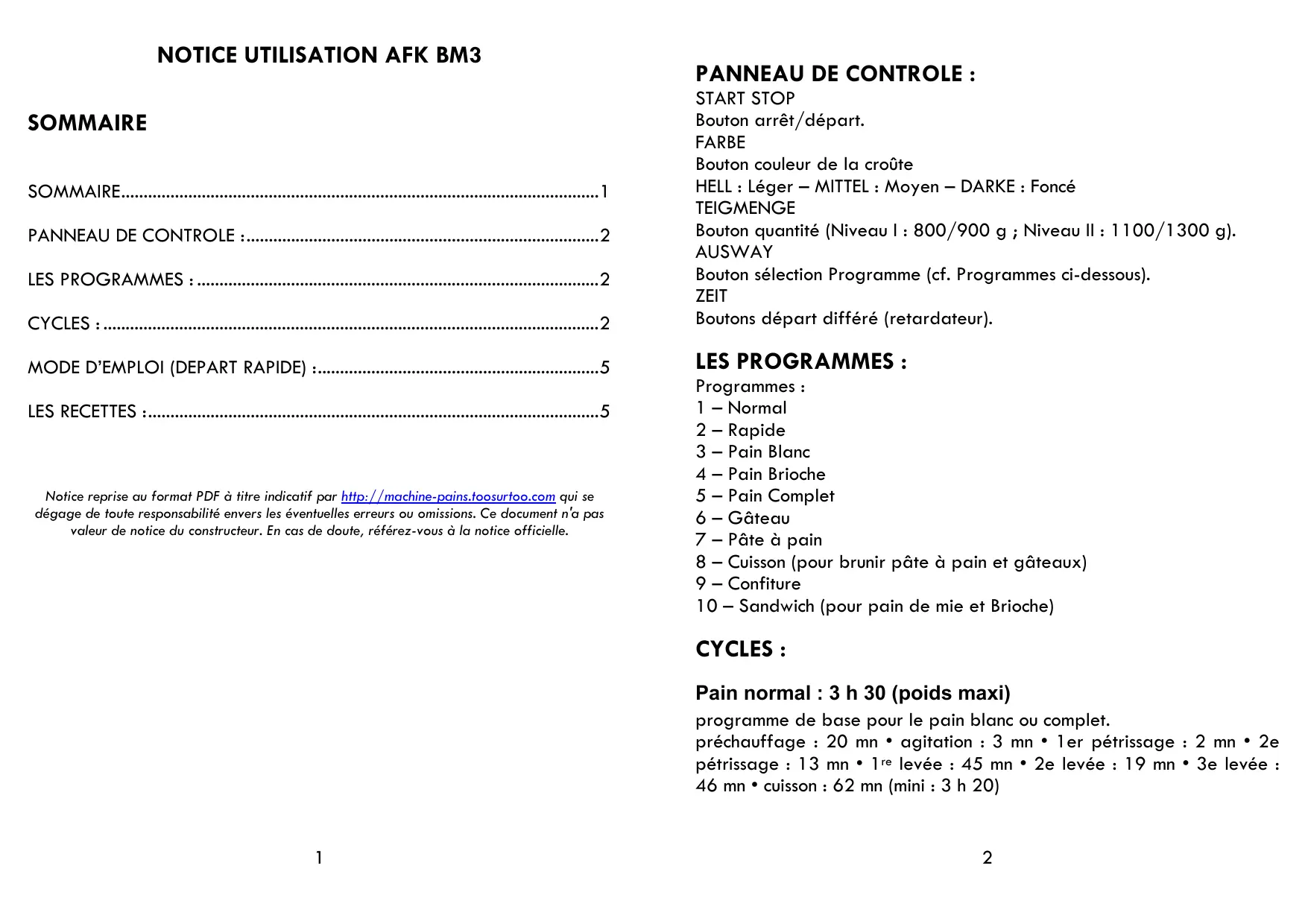 BM3 - Machine à pain AFK - Notice d'utilisation et mode d'emploi gratuit