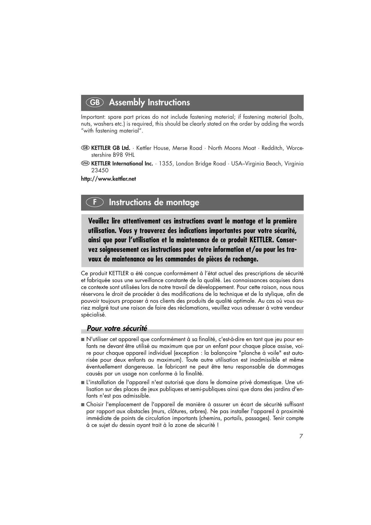Ce produit KETTLER a été conçue conformément à l’état actuel des prescriptions de sécurité et fabriquée sous une surveillance constante de la qualité. Les connaissances acquises dans ce contexte sont utilisées lors de notre travail de développement. Pour cette raison, nous nous réservons le droit de procéder à des modifications de la technique et de la stylique, afin de pouvoir toujours proposer à nos clients des produits de qualité optimale. Au cas où vous auriez malgré tout une raison de faire des réclamations, veuillez vous adresser à votre vendeur spécialisé.