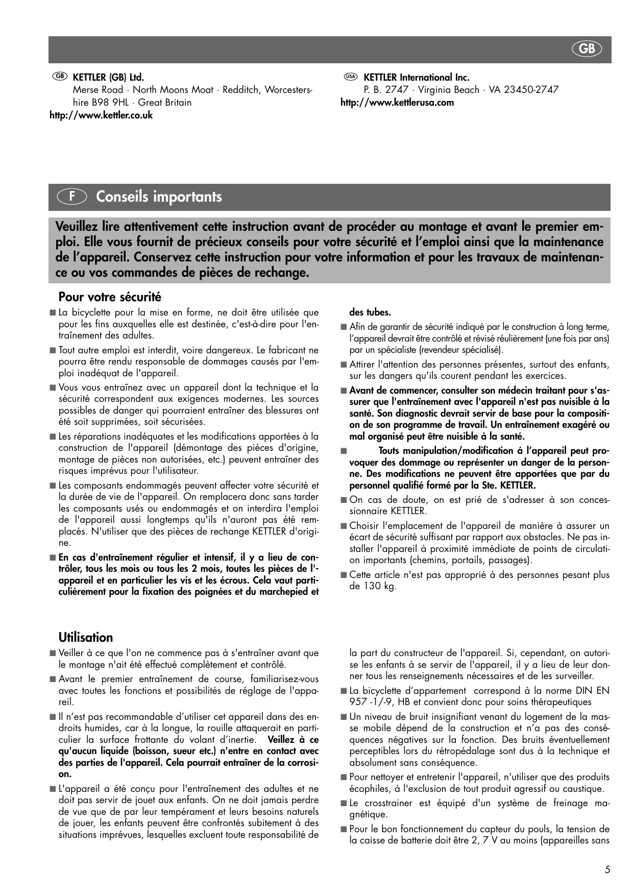 la durée de vie de l'appareil. On remplacera donc sans tarder les composants usés ou endommagés et on interdira l'emploi de l'appareil aussi longtemps qu'ils n'auront pas été remplacés. N'utiliser que des pièces de rechange KETTLER d'origine.