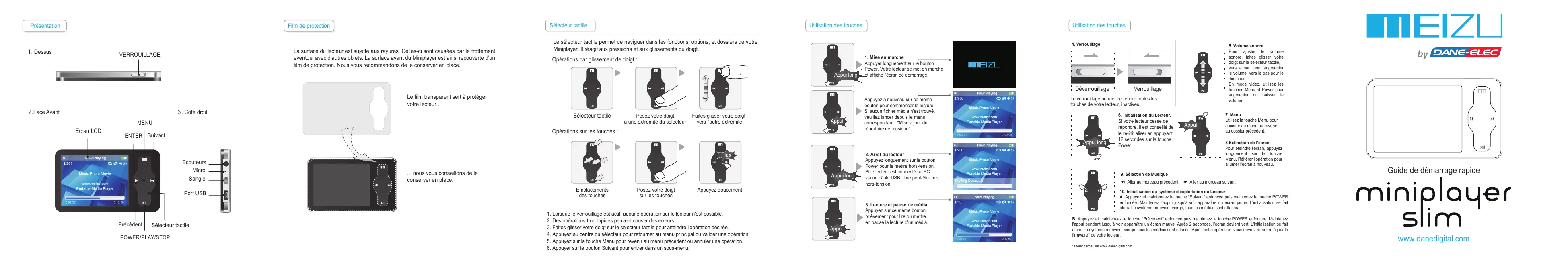 1 . Dessus La surface du lecteur est sujette aux rayures. Celles-ci sont causées par le frottement eventuel avec d'autres objets. La surface avant du Miniplayer est ainsi recouverte d'un film de protection. Nous vous recommandons de le conserver en place. VERROUILLAGE Utilisation des touches Sélecteur tactile Film de protection Présentation Utilisation des touches Le sélecteur tactile permet de naviguer dans les fonctions, options, et dossiers de votre Miniplayer. Il réagit aux pressions et aux glissements du doigt.