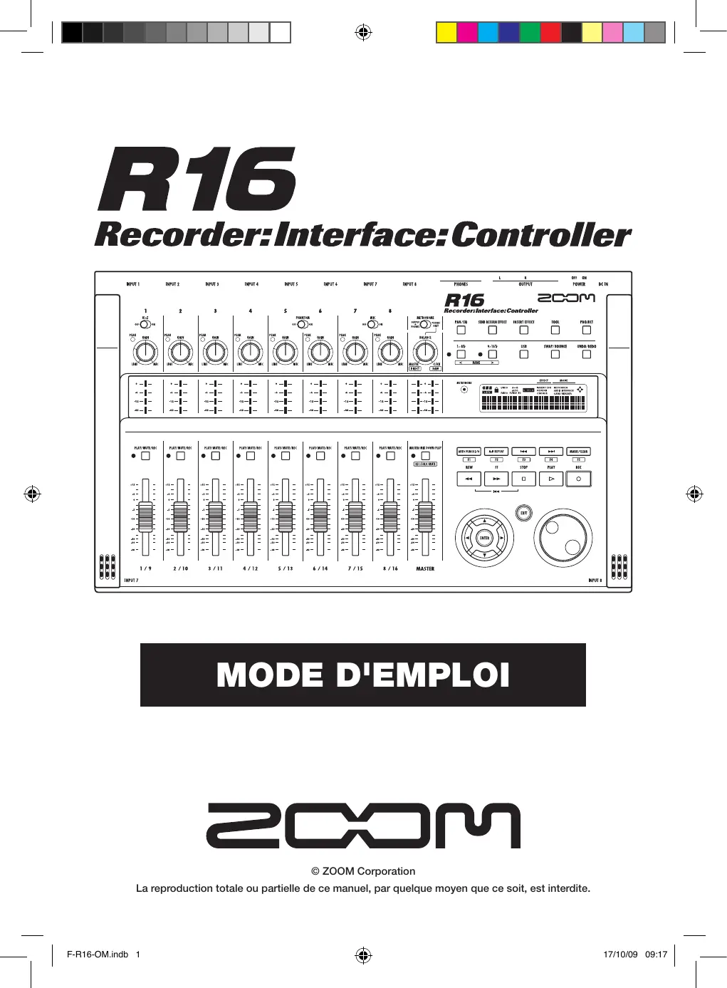 F-R16-OM.indb 1 17/10/09 09:17 Introduction Enregistreur multipiste utilisant des cartes SDHC pouvant atteindre 32 Go Le R16 peut enregistrer simultanément sur 8 pistes. Par exemple, un groupe entier peut être enregistré sur des pistes individuelles ou plusieurs microphones peuvent être placés autour d'un kit de batterie. Après avoir enregistré en PCM linéaire (type WAV) à une fréquence d'échantillonnage de 44,1 kHz en 16/24 bits, vous pouvez transférer les fichiers enregistrés sur votre ordinateur pour les utiliser dans votre logiciel station de travail audio numérique (que nous appellerons dorénavant DAW, de l'anglais Digital Audio Workstation). Vous pouvez même relier deux R16 à l'aide d'un câble USB pour enregistrer un maximum de 16 pistes. Gère diverses sources d'entrée dont les guitares, microphones et équipements de niveau ligne Le R16 est équipé de 8 prises d'entrée qui acceptent à la fois les fiches XLR et jack, dont une qui peut gérer des signaux à haute impédance et deux qui fournissent une alimentation fantôme 48 V. Le R16 peut accepter des guitares et basses à haute impédance, des microphones dynamiques et à condensateur et divers instruments de niveau ligne tels que des synthétiseurs. Il a également deux microphones intégrés à hautes performances qui sont très pratiques pour enregistrer la guitare acoustique et les voix. Interface audio USB haute vitesse (USB 2.0) Vous pouvez utiliser le R16 comme une interface audio USB haute vitesse (USB 2.0) disposant d'une abondance de prises d'entrée et de sortie. Le R16 peut gérer 8 entrées et 2 sorties à une résolution maximale de 24 bits et 96 kHz, et ses effets peuvent même être utilisés à une fréquence d'échantillonnage de 44,1 kHz. L'unité peut également fonctionner en n'étant alimentée que par le bus USB. Fonctions de mixage complètes et intégrées Le R16 est équipé d'un mélangeur numérique qui vous permet de mixer la reproduction des pistes audio enregistrées et importées. Vous pouvez régler le panoramique, l'égaliseur et les effets pour chaque piste et mixer le tout en une sortie stéréo. Utilisable comme surface de contrôle pour un logiciel DAW Le R16 est équipé de fonctions qui vous permettent de contrôler le logiciel DAW d'un ordinateur via un câble USB. Vous pouvez piloter le transport du logiciel DAW, qu'il s'agisse de lecture, d'enregistrement ou d'arrêt, et vous pouvez physiquement contrôler les mouvements de faders. Vous pouvez aussi assigner différentes fonctions de DAW aux touches de fonction F1–F5 du R16 (les fonctions assignables dépendent du logiciel DAW). Différents effets Le R16 a deux effets intégrés principaux – un effet par insertion qui peut être appliqué aux signaux d'un canal spécifique et un effet en boucle départ-retour qui peut être utilisé comme le bus départ/retour d'une table de mixage. Vous pouvez utiliser ces effets d'une grande diversité de façon, y compris durant l'enregistrement, en les appliquant à des pistes déjà enregistrées ou lors d'opérations de mastering telles que le mixage final et le report de pistes. Introduction Merci beaucoup d'avoir choisi l'enregistreur/interface/contrôleur R16 ZOOM. Dans ce mode d'emploi, nous l'appellerons le R16. Le R16 a les caractéristiques suivantes. Multiples modes d'accordeur et un métronome comme guide rythmique Le R16 n'a pas seulement une fonction d'accordage chromatique standard, mais aussi des fonctions pour les accordages inhabituels, dont les guitares 7 cordes et basses 5 cordes. Le métronome peut être utilisé comme guide rythmique pendant que vous enregistrez. Vous pouvez faire jouer le son du métronome au travers des prises OUTPUT de la table de mixage ou l'envoyer uniquement au casque si vous le désirez. Par exemple, en "live", vous pouvez envoyer le clic uniquement au batteur via la sortie casque. Échange de fichiers avec des ordinateurs et clés mémoire USB Le R16 a un port USB 2.0 qui permet le transfert des données à haute vitesse. Vous pouvez transférer dans un ordinateur des fichiers audio WAV enregistrés sur le R16 par simple glisser/déposer. Vous pouvez aussi échanger des fichiers avec une clé mémoire USB connectée sans avoir à utiliser l'ordinateur. Veuillez lire attentivement ce mode d'emploi afin de bien comprendre les fonctions du R16. Après l'avoir lu, veuillez le conserver avec la garantie en lieu sûr. *Les caractéristiques sont sujettes à modifications pour améliorations sans préavis.