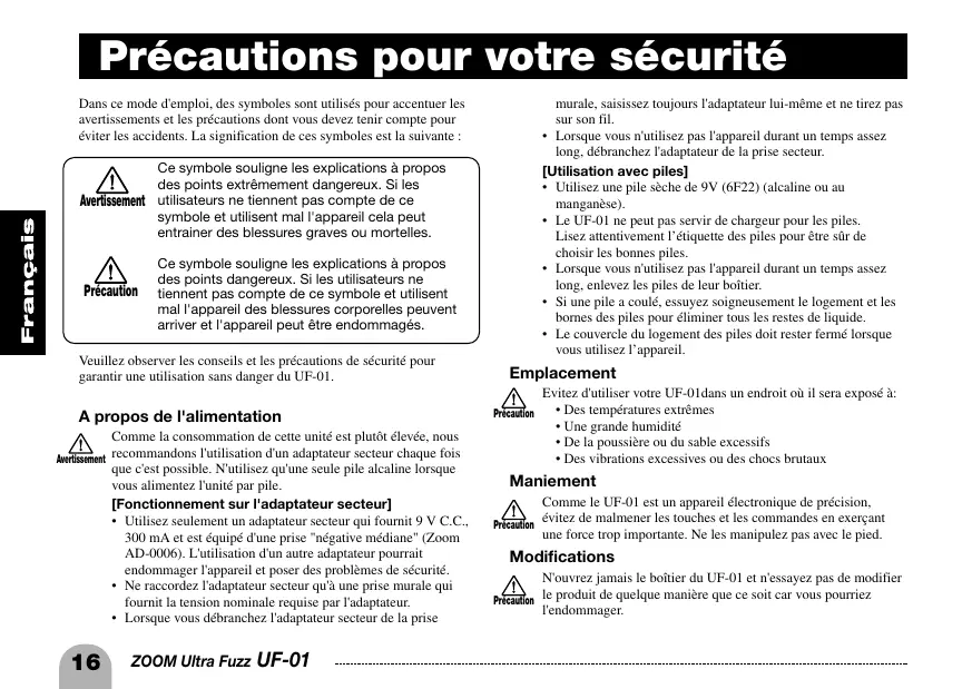 - Le couvercle du logement des piles doit rester fermé lorsque vous utilisez l’appareil. Ce symbole souligne les explications à propos des points extrêmement dangereux. Si les Avertissement utilisateurs ne tiennent pas compte de ce symbole et utilisent mal l'appareil cela peut entrainer des blessures graves ou mortelles. Précaution Ce symbole souligne les explications à propos des points dangereux. Si les utilisateurs ne tiennent pas compte de ce symbole et utilisent mal l'appareil des blessures corporelles peuvent arriver et l'appareil peut être endommagés. Veuillez observer les conseils et les précautions de sécurité pour garantir une utilisation sans danger du UF-01. A propos de l'alimentation Emplacement Précaution Comme la consommation de cette unité est plutôt élevée, nous Avertissement recommandons l'utilisation d'un adaptateur secteur chaque fois que c'est possible. N'utilisez qu'une seule pile alcaline lorsque vous alimentez l'unité par pile. [Fonctionnement sur l'adaptateur secteur]