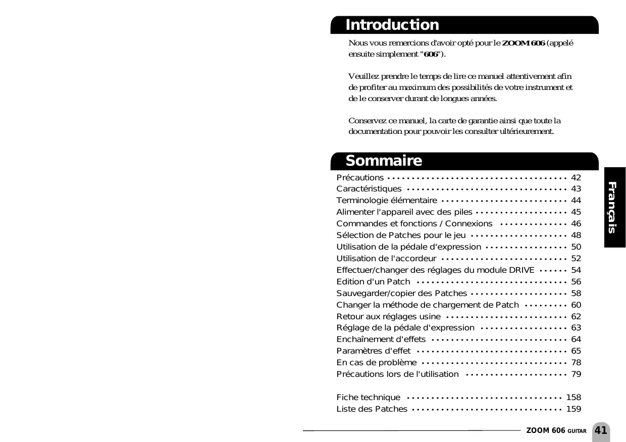 Français Précautions • • • • • • • • • • • • • • • • • • • • • • • • • • • • • • • • • • • • • Caractéristiques • • • • • • • • • • • • • • • • • • • • • • • • • • • • • • • • • Terminologie élémentaire • • • • • • • • • • • • • • • • • • • • • • • • • • Alimenter l'appareil avec des piles • • • • • • • • • • • • • • • • • • • Commandes et fonctions / Connexions • • • • • • • • • • • • • • Sélection de Patches pour le jeu • • • • • • • • • • • • • • • • • • • • Utilisation de la pédale d'expression • • • • • • • • • • • • • • • • • Utilisation de l'accordeur • • • • • • • • • • • • • • • • • • • • • • • • • • Effectuer/changer des réglages du module DRIVE • • • • • • Edition d'un Patch • • • • • • • • • • • • • • • • • • • • • • • • • • • • • • • Sauvegarder/copier des Patches • • • • • • • • • • • • • • • • • • • • Changer la méthode de chargement de Patch • • • • • • • • • Retour aux réglages usine • • • • • • • • • • • • • • • • • • • • • • • • • Réglage de la pédale d'expression • • • • • • • • • • • • • • • • • • Enchaînement d'effets • • • • • • • • • • • • • • • • • • • • • • • • • • • • Paramètres d'effet • • • • • • • • • • • • • • • • • • • • • • • • • • • • • • • En cas de problème • • • • • • • • • • • • • • • • • • • • • • • • • • • • • • Précautions lors de l'utilisation • • • • • • • • • • • • • • • • • • • • • Fiche technique • • • • • • • • • • • • • • • • • • • • • • • • • • • • • • • • 158 Liste des Patches • • • • • • • • • • • • • • • • • • • • • • • • • • • • • • • 159 ZOOM 606 GUITAR