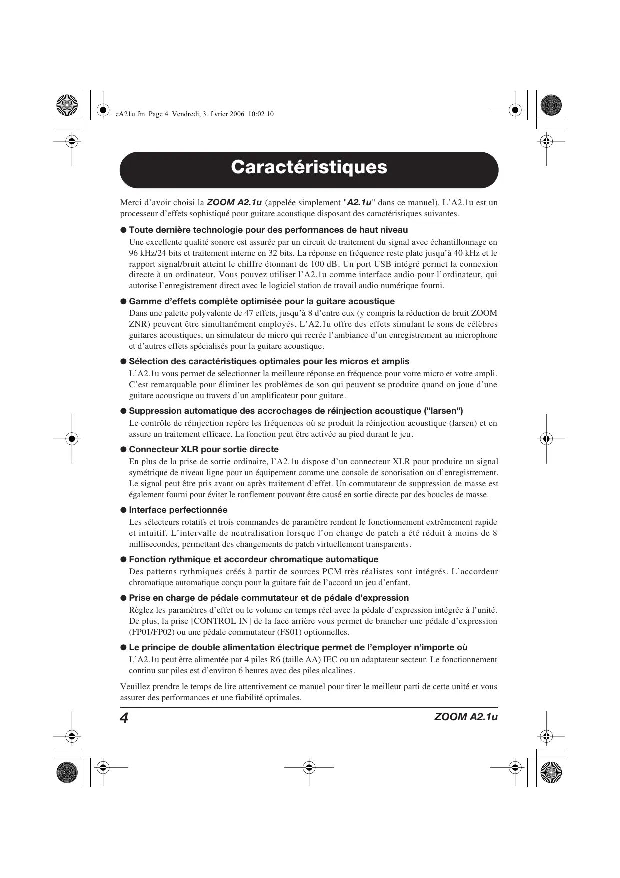 eA21u.fm Page 4 Vendredi, 3. f vrier 2006 10:02 10 Caractéristiques Merci d’avoir choisi la ZOOM A2.1u (appelée simplement " A2.1u" dans ce manuel). L’A2.1u est un processeur d’effets sophistiqué pour guitare acoustique disposant des caractéristiques suivantes. ● Toute dernière technologie pour des performances de haut niveau Une excellente qualité sonore est assurée par un circuit de traitement du signal avec échantillonnage en 96 kHz/24 bits et traitement interne en 32 bits. La réponse en fréquence reste plate jusqu’à 40 kHz et le rapport signal/bruit atteint le chiffre étonnant de 100 dB. Un port USB intégré permet la connexion directe à un ordinateur. Vous pouvez utiliser l’A2.1u comme interface audio pour l’ordinateur, qui autorise l’enregistrement direct avec le logiciel station de travail audio numérique fourni. ● Gamme d’effets complète optimisée pour la guitare acoustique Dans une palette polyvalente de 47 effets, jusqu’à 8 d’entre eux (y compris la réduction de bruit ZOOM ZNR) peuvent être simultanément employés. L’A2.1u offre des effets simulant le sons de célèbres guitares acoustiques, un simulateur de micro qui recrée l’ambiance d’un enregistrement au microphone et d’autres effets spécialisés pour la guitare acoustique. ● Sélection des caractéristiques optimales pour les micros et amplis L’A2.1u vous permet de sélectionner la meilleure réponse en fréquence pour votre micro et votre ampli. C’est remarquable pour éliminer les problèmes de son qui peuvent se produire quand on joue d’une guitare acoustique au travers d’un amplificateur pour guitare. ● Suppression automatique des accrochages de réinjection acoustique ("larsen") Le contrôle de réinjection repère les fréquences où se produit la réinjection acoustique (larsen) et en assure un traitement efficace. La fonction peut être activée au pied durant le jeu. ● Connecteur XLR pour sortie directe En plus de la prise de sortie ordinaire, l’A2.1u dispose d’un connecteur XLR pour produire un signal symétrique de niveau ligne pour un équipement comme une console de sonorisation ou d’enregistrement. Le signal peut être pris avant ou après traitement d’effet. Un commutateur de suppression de masse est également fourni pour éviter le ronflement pouvant être causé en sortie directe par des boucles de masse. ● Interface perfectionnée Les sélecteurs rotatifs et trois commandes de paramètre rendent le fonctionnement extrêmement rapide et intuitif. L’intervalle de neutralisation lorsque l’on change de patch a été réduit à moins de 8 millisecondes, permettant des changements de patch virtuellement transparents. ● Fonction rythmique et accordeur chromatique automatique Des patterns rythmiques créés à partir de sources PCM très réalistes sont intégrés. L’accordeur chromatique automatique conçu pour la guitare fait de l’accord un jeu d’enfant. ● Prise en charge de pédale commutateur et de pédale d’expression Règlez les paramètres d’effet ou le volume en temps réel avec la pédale d’expression intégrée à l’unité. De plus, la prise [CONTROL IN] de la face arrière vous permet de brancher une pédale d’expression (FP01/FP02) ou une pédale commutateur (FS01) optionnelles. ● Le principe de double alimentation électrique permet de l’employer n’importe où L’A2.1u peut être alimentée par 4 piles R6 (taille AA) IEC ou un adaptateur secteur. Le fonctionnement continu sur piles est d’environ 6 heures avec des piles alcalines. Veuillez prendre le temps de lire attentivement ce manuel pour tirer le meilleur parti de cette unité et vous assurer des performances et une fiabilité optimales.