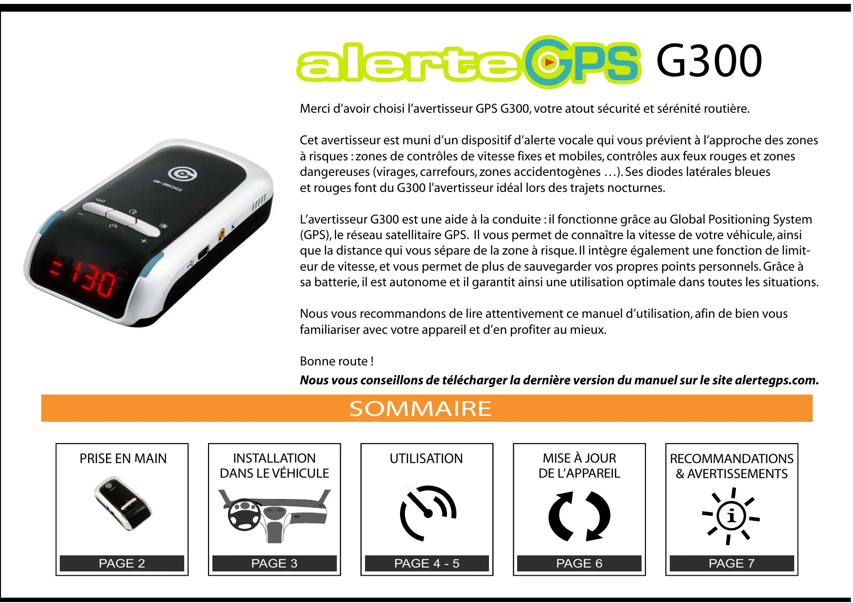 Merci d'avoir choisi l'avertisseur GPS G300, votre atout sécurité et sérénité routière. Cet avertisseur est muni d'un dispositif d'alerte vocale qui vous prévient à l'approche des zones à risques :zones de contrôles de vitesse fixes et mobiles, contrôles aux feux rouges et zones dangereuses (virages, carrefours, zones accidentogènes …).Ses diodes latérales bleues et rouges font du G300 l'avertisseur idéal lors des trajets nocturnes. L'avertisseur G300 est une aide à la conduite :il fonctionne grâce au Global Positioning System (GPS), le réseau satellitaire GPS. Il vous permet de connaître la vitesse de votre véhicule, ainsi que la distance qui vous sépare de la zone à risque. Il intègre également une fonction de limit- eur de vitesse, et vous permet de plus de sauvegarder vos propres points personnels. Grâce à sa batterie, il est autonome et il garantit ainsi une utilisation optimale dans toutes les situations. Nous vous recommandons de lire attentivement ce manuel d'utilisation, afin de bien vous familiariser avec votre appareil et d'en profiter au mieux. Bonne route ! Nous vous conseillons de télécharger la dernière version du manuel sur le site alertegps.com. SOMMAIRE PRISE EN MAIN INSTALLATION UTILISATION MISE À JOUR RECOMMANDATIONS DANS LE VÉHICULE DE L'APPAREIL & AVERTISSEMENTS \Ÿ ee NQ Q Ye