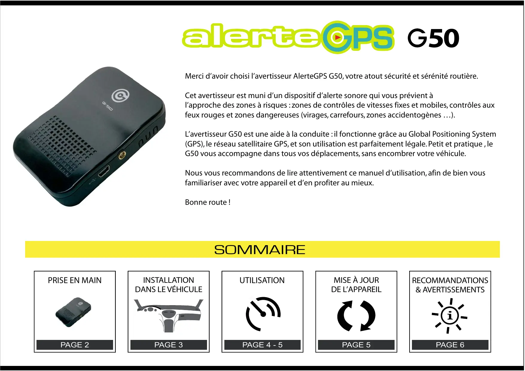 Merci d’avoir choisi l’avertisseur AlerteGPS G50, votre atout sécurité et sérénité routière. Cet avertisseur est muni d’un dispositif d’alerte sonore qui vous prévient à l’approche des zones à risques : zones de contrôles de vitesses fixes et mobiles, contrôles aux feux rouges et zones dangereuses (virages, carrefours, zones accidentogènes …). L’avertisseur G50 est une aide à la conduite : il fonctionne grâce au Global Positioning System (GPS), le réseau satellitaire GPS, et son utilisation est parfaitement légale. Petit et pratique , le G50 vous accompagne dans tous vos déplacements, sans encombrer votre véhicule. Nous vous recommandons de lire attentivement ce manuel d’utilisation, afin de bien vous familiariser avec votre appareil et d’en profiter au mieux. Bonne route ! SOMMAIRE